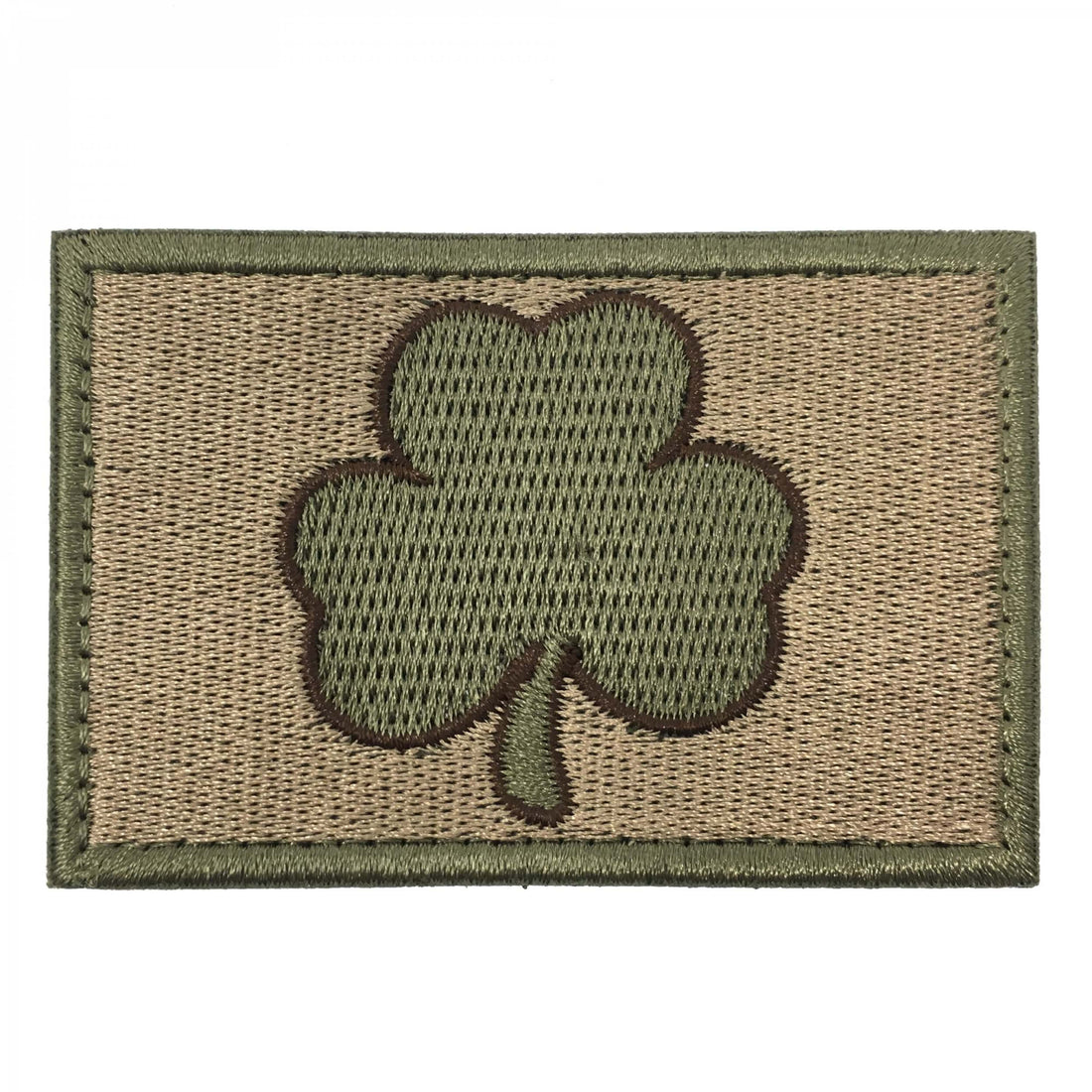 Woven fabric patch with embroidered shamrock. A Velcro strap is sewn on the back and...