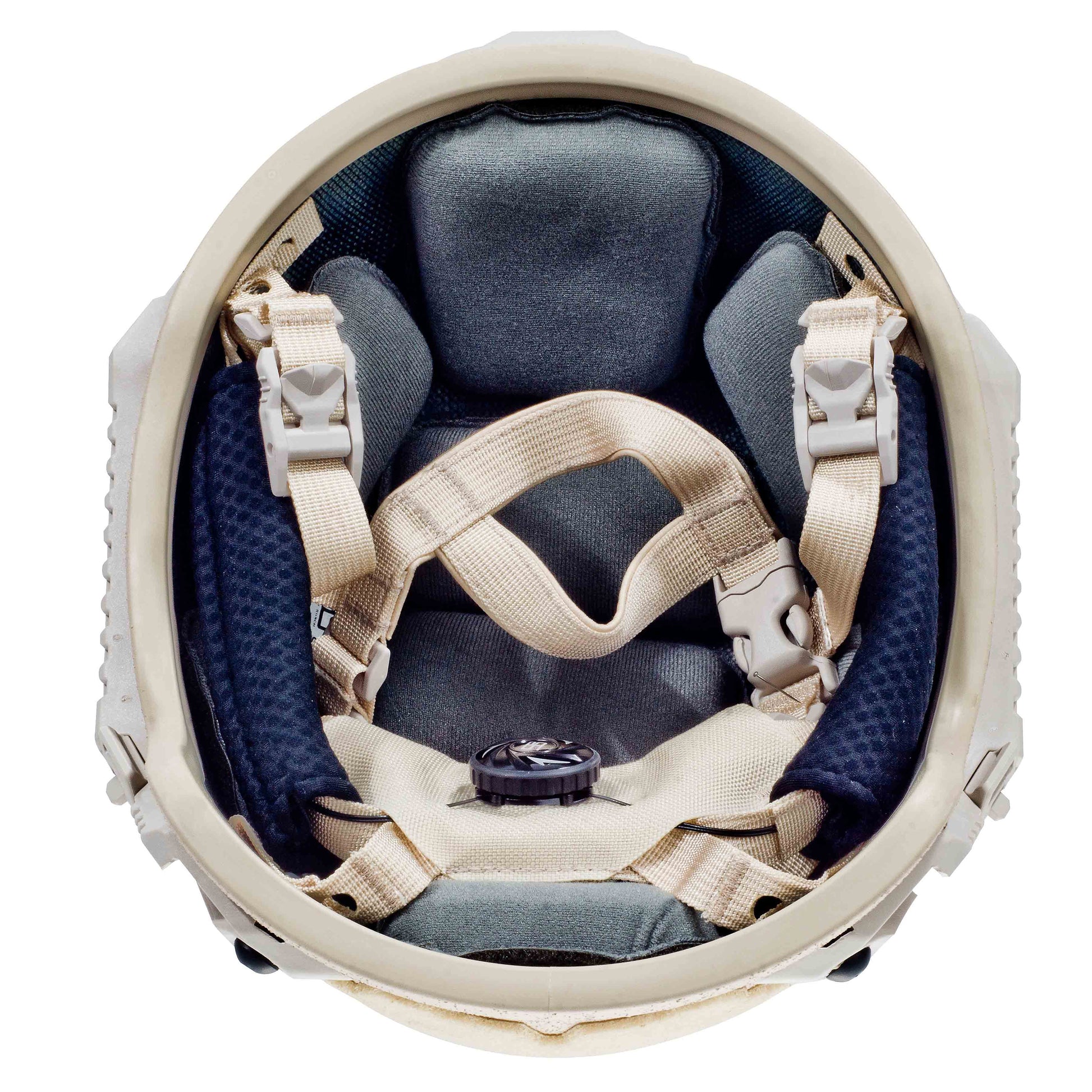 Die 4-Punkt-Befestigung des Harness-Gurtes gewährleistet einen optimalen Sitz und Tragekomfort. Durch RD-Verstellsystem (Ratchet Dial) auf dem Nackenpolster kann das Harness einfach mit einer Hand in Sekundenschnelle verstellt werden. Das speziell entwickelte verstellbare Befestigungssystem stabilisiert das Gewicht des Trägers beim Tragen Helmes mit einem ballistischen Visier.