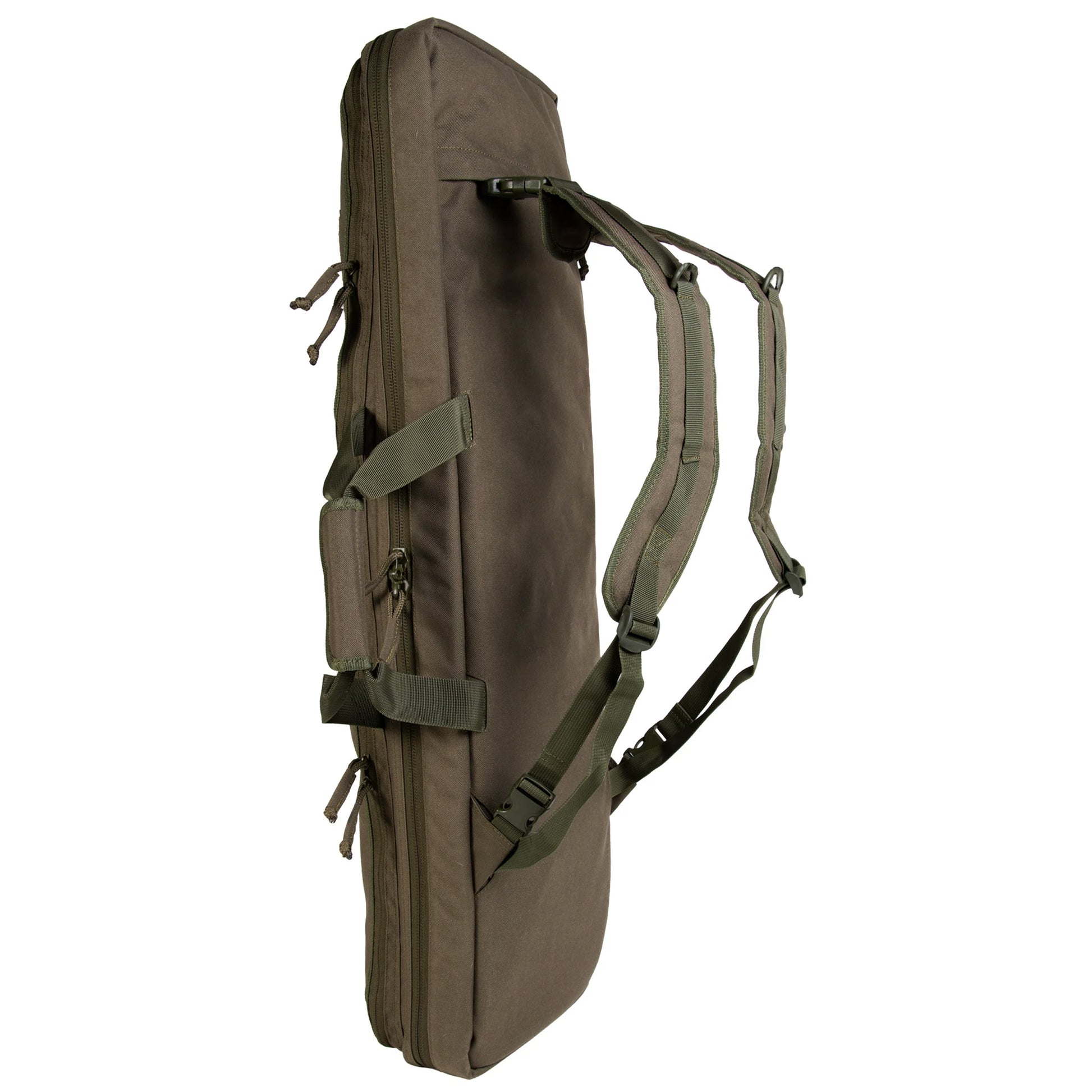 Die Waffentragetasche kann mit den ergonomisch geformte und gepolsterten Rucksack-Schultergurten auf dem Rücken getragen werden. Die Schultergurte sind abnehmbar und können bei Bedarf im Rücken verstaut werden. Durch den gepolsterten Rückenbereich und die innenliegende Kunstoffplatte, lässt sich die Tasche angenehm auf dem Rücken tragen.