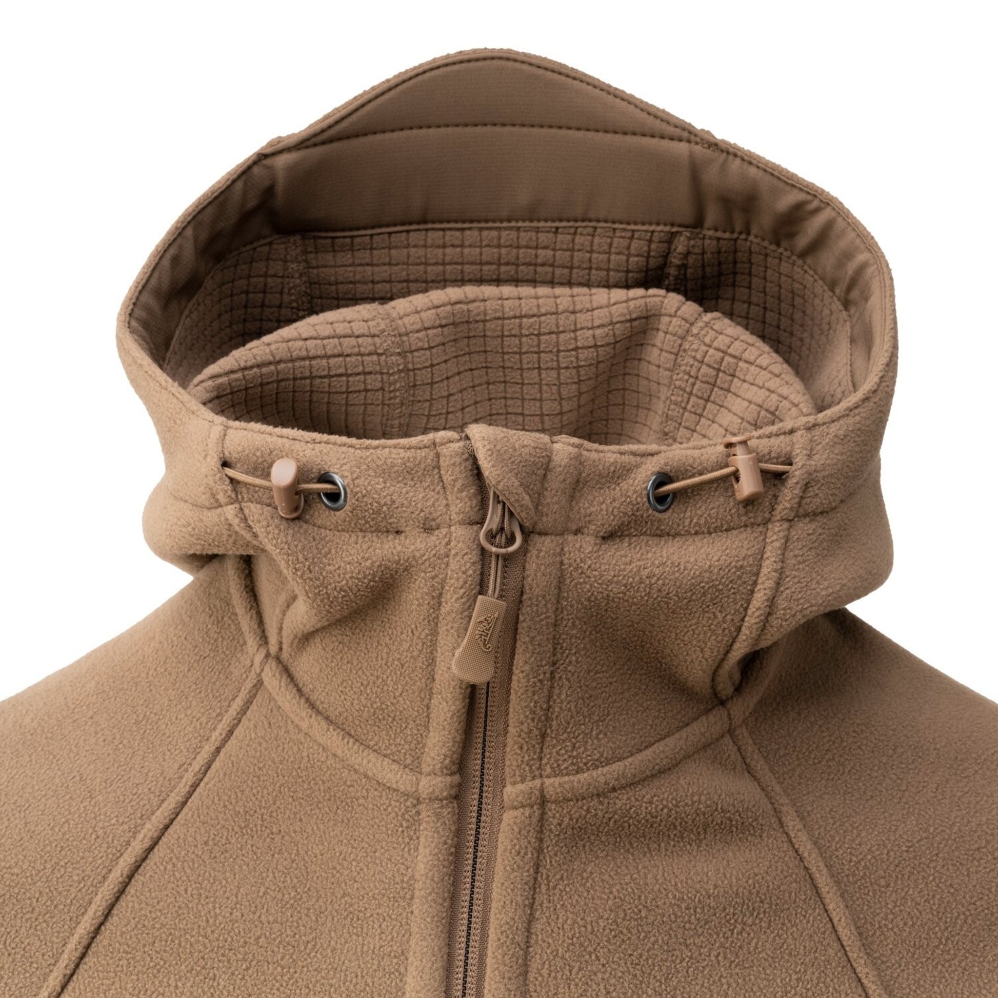 Das Hybrid-Fleece-Material besteht aus zwei verschiedenen Schichten. Außen ähnelt es einem klassischen Fleece, aber innen ist es ein Gitterfleece, bekannt von dem Alpha Hoodie und der Alpha Tactical Jacke. Es handelt sich um ein Material mit einer charakteristischen Feinkaro-Struktur aus dickeren, erhabenen quadratischen Stücken und dünneren Lücken dazwischen. Das macht die Patriot Mk2 leichter und atmungsaktiver, hält aber trotzdem warm. Belüftungsöffnungen mit Reißverschluss unter den Armen helfen bei der Wärmeregulierung.