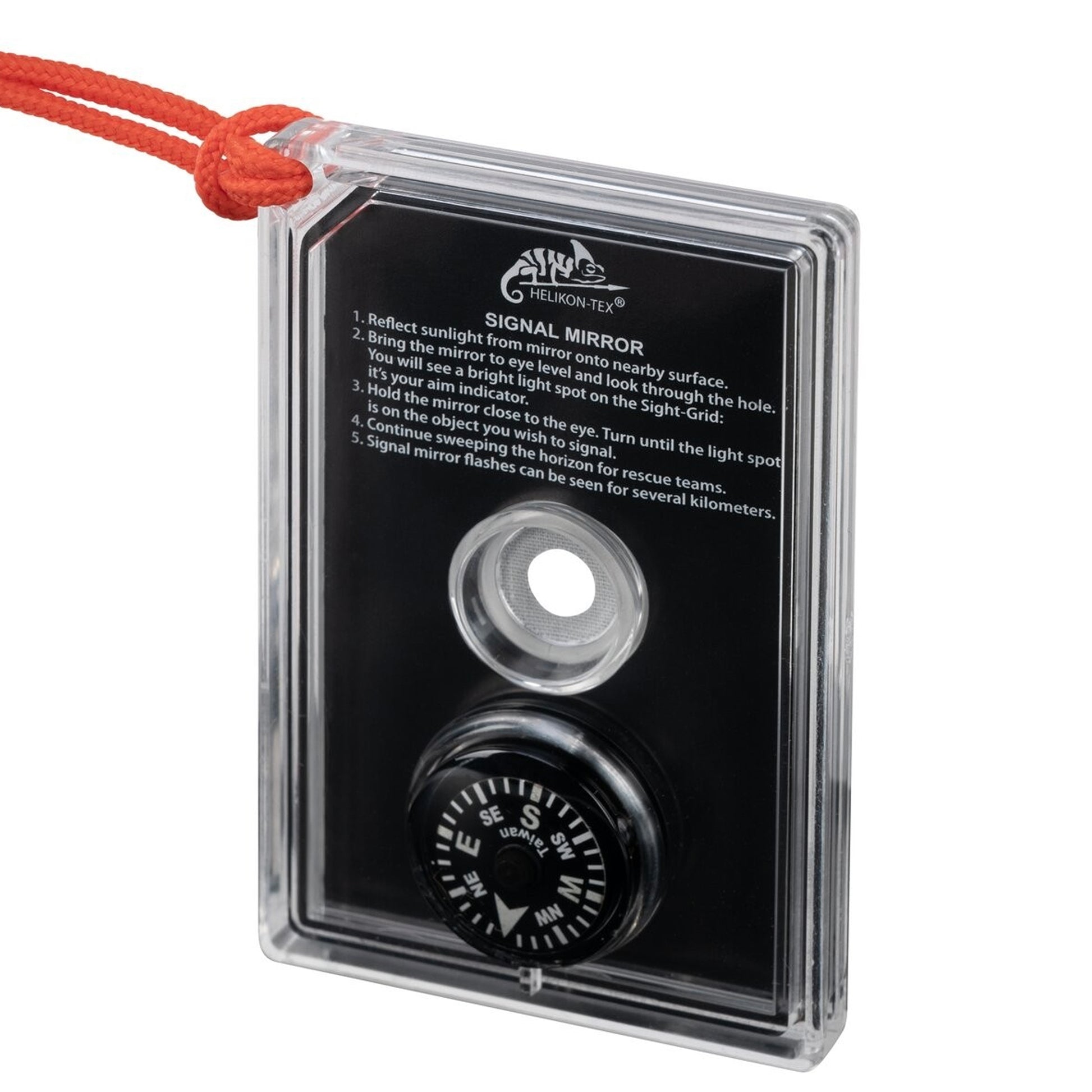 Der Signalspiegel hat eine spezielle Öffnung, die wie ein Kollimator funktioniert. So können Sie das reflektierte Licht auf größere Entfernungen ausrichten. Im Notfall können Sie mit einem SOS-Signal um Hilfe rufen, indem Sie ein Schiff oder ein Flugzeug anvisieren. Die Sichtbarkeit hängt von Sonnenlicht, Wetter und Gelände ab, aber bei guten Bedingungen ist das reflektierte Licht sogar aus mehreren Kilometern Entfernung zu sehen. Auf der Rückseite des Signal Mirror befinden sich eine Anleitung und ein kleiner Kompass.