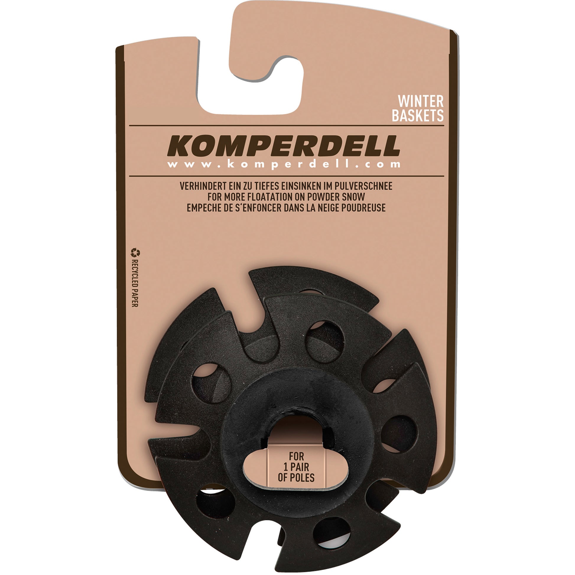 Die Winterteller für die Komperdell-Trekkingstöcke mit dem Vario-System. Verhindern das tiefe Einsinken im Pulverschnee. Die Teller werden einfach über die Spitze gesteckt und mit einer Umdrehung fixiert.