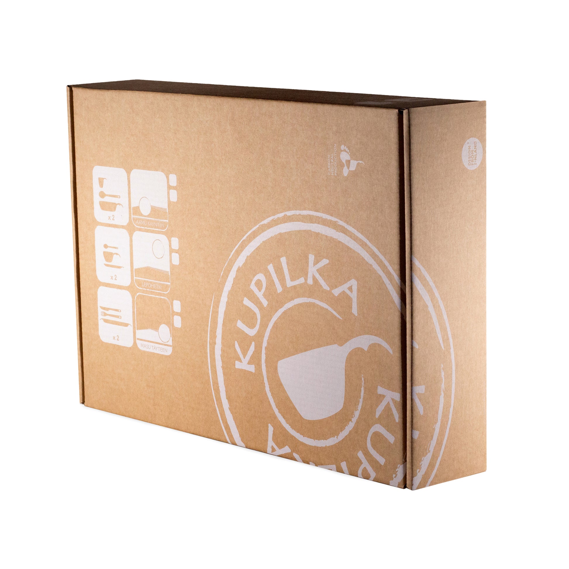 KUPILKA bedeutet, kleine Tasse”. Es ist abgeleitet von, „Kuppi”, dem finnischen Wort für Tasse. Es stammt aus der Zeit vor dem ersten Weltkrieg als finnische Frauen und Männer während der harten Finnischen Winter sich beim Trinken mit der „Kupilka” oder kleinen „Tasse” sich die Hände aufgewärmt haben. Die KUPILKA Produkte werden aus einem Biomaterial hergestellt. Das Biomaterial besteht aus einem Naturfaser-Verbundmaterial, das aus 50% Holzfasern und 50% aus Plastikmaterial (Polypropen) zusammengesetzt ist. Verglichen mit Plastik sind die Vorteile des Naturfaser-Verbundmaterials neben der besseren Hitzebeständigkeit und höheren Nutzungsdauer vor allem die solide Konstruktion. Im Vergleich zu Holz muss das Material nicht gepflegt werden. Zudem nimmt es keine Gerüche auf und ist feuchtigkeitsbeständig. Alle KUPILKA Produkte sind spülmaschinengeeignet. Hochqualitatives Design in Verbindung mit neuen. Technologien ehrt die Natur mit umweltfreundlichem Geschirr. Kupilka ist Ihr bester Gefährte in der Natur.