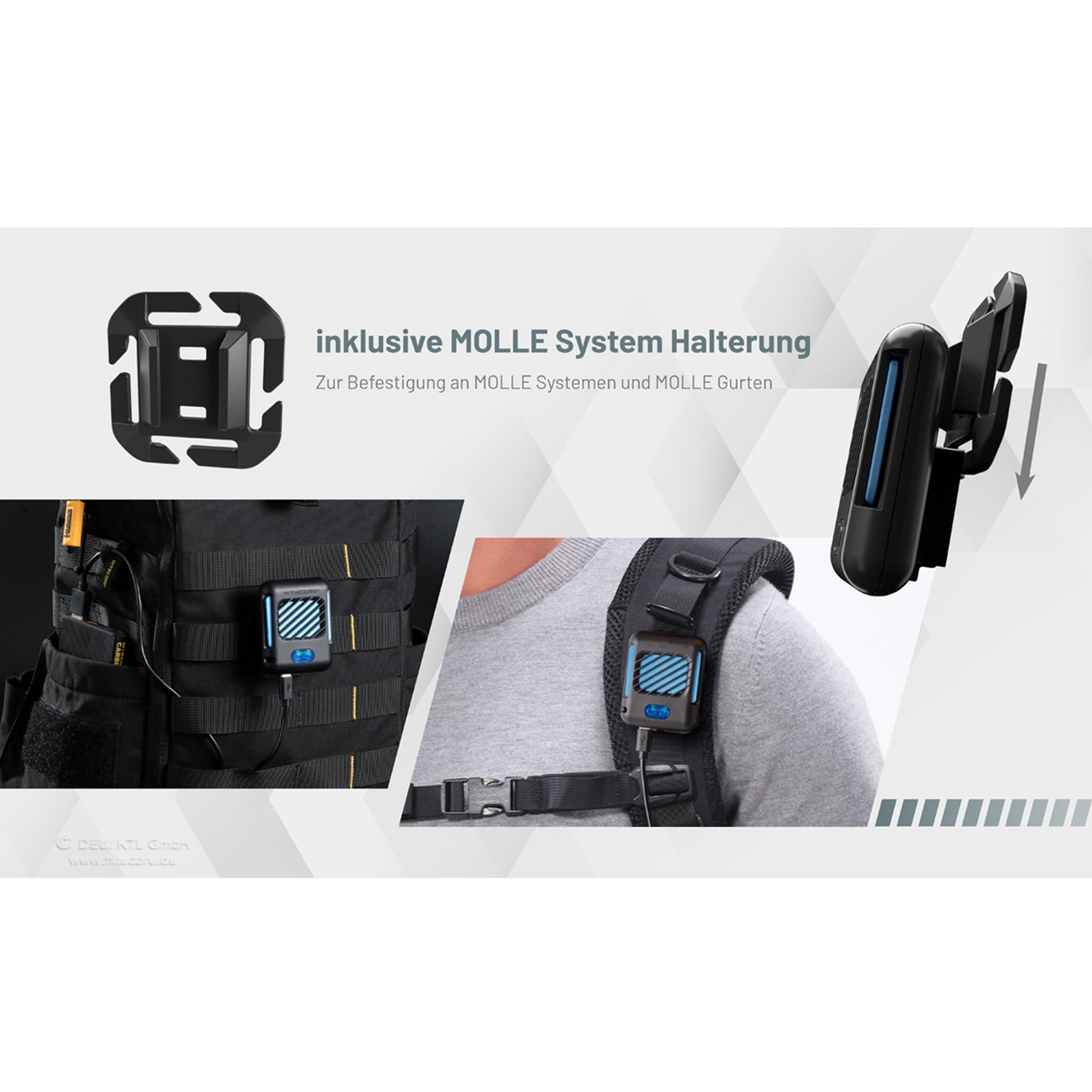 Der verdampfte Wirkstoff ist geruchsneutral und erzeugt eine "Duftglocke" von ca. 5 Meter Durchmesser. EIn Wirkstoffplättchen reicht für ca. 4 Stunden. Durch das MOLLE-Halterung lässt sich das EMR05 einfach an der Ausrüstung befestigen.
