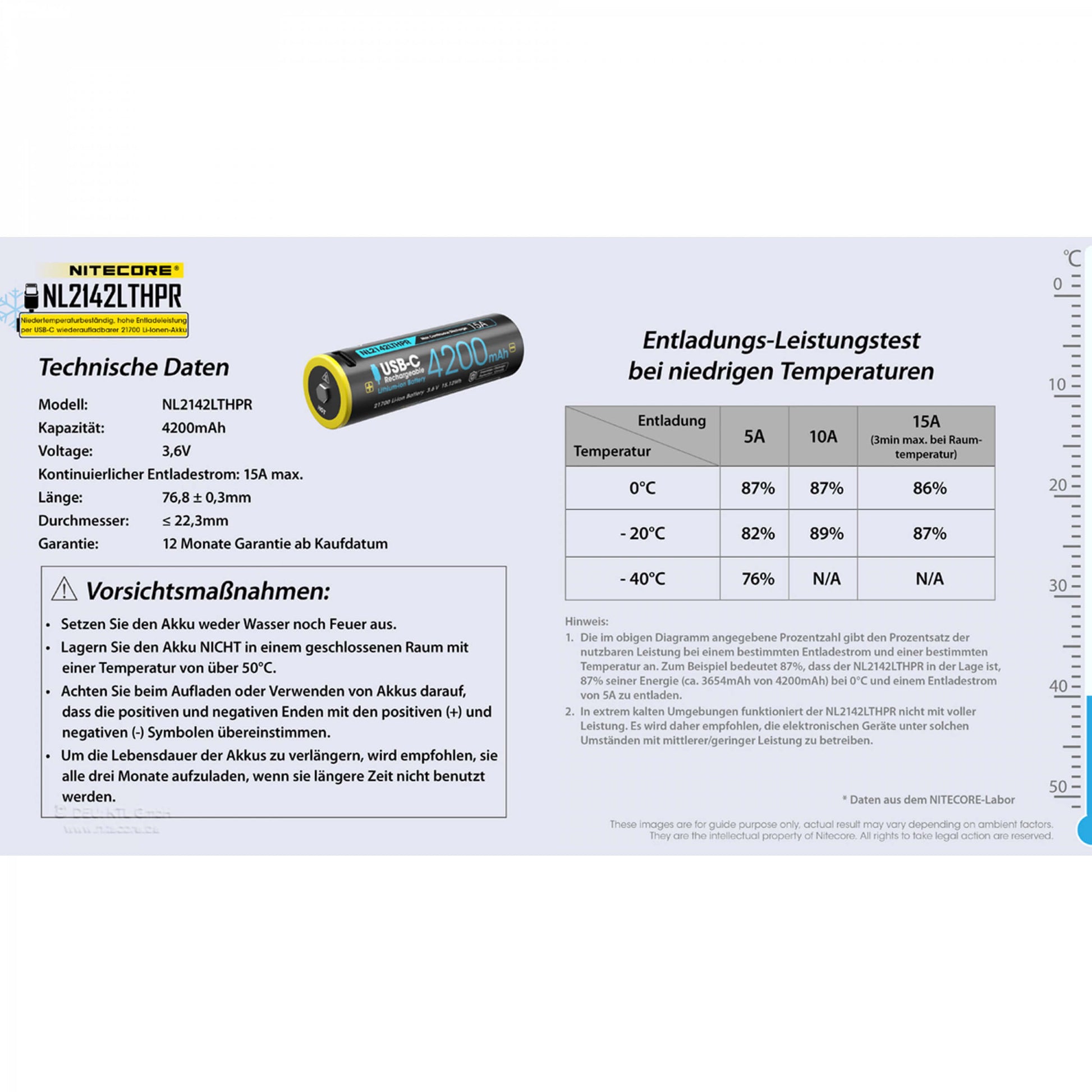 Der Nitecore Li-Ion Akku Typ 21700 NL2142LTHPR hat eine Kapazität von 4200mAh und ist temperaturfest bis -40°C.  Bei -40°C behält dieser Akku noch ca. 76% seiner Kapazität und ist somit die ideale Stromquelle für Ihre Taschenlampe in der kalten Jahreszeit.