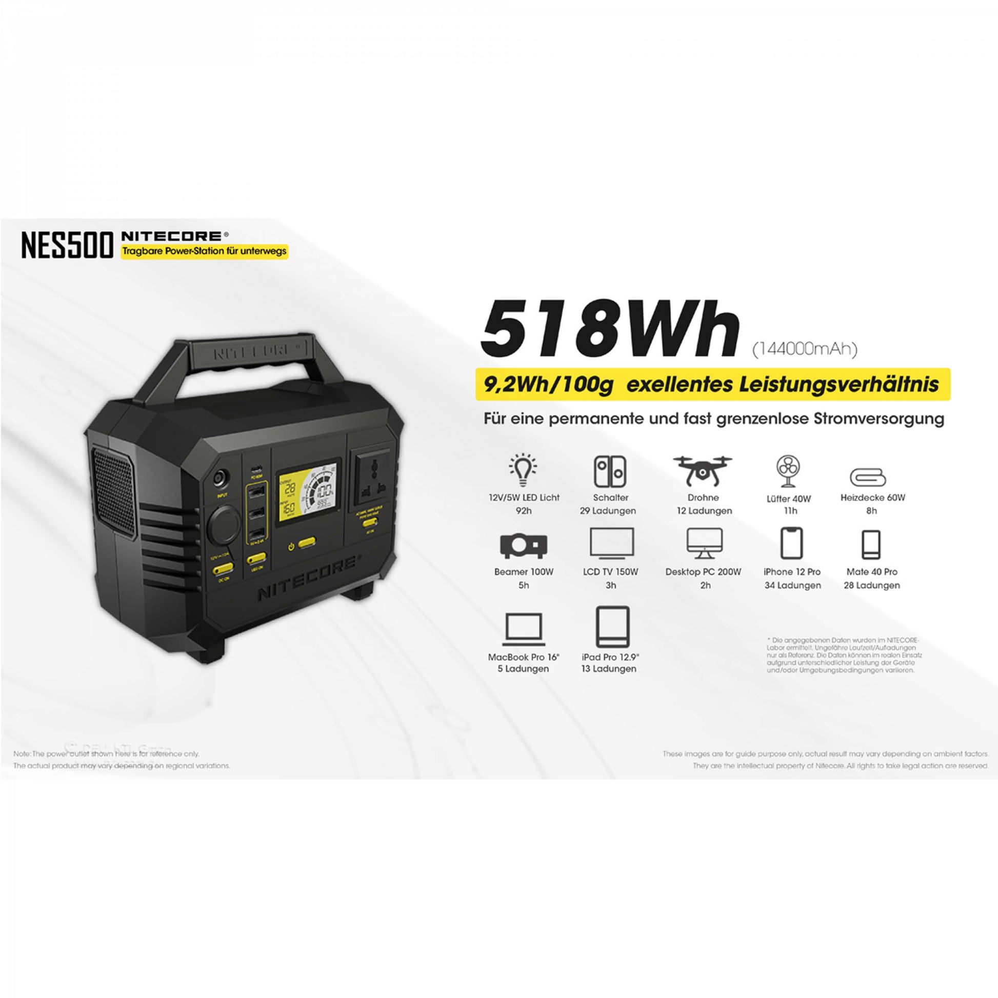 Die Nitecore Powerstation NES500 liefert eine Leistung von 518Wh (144000mAh).