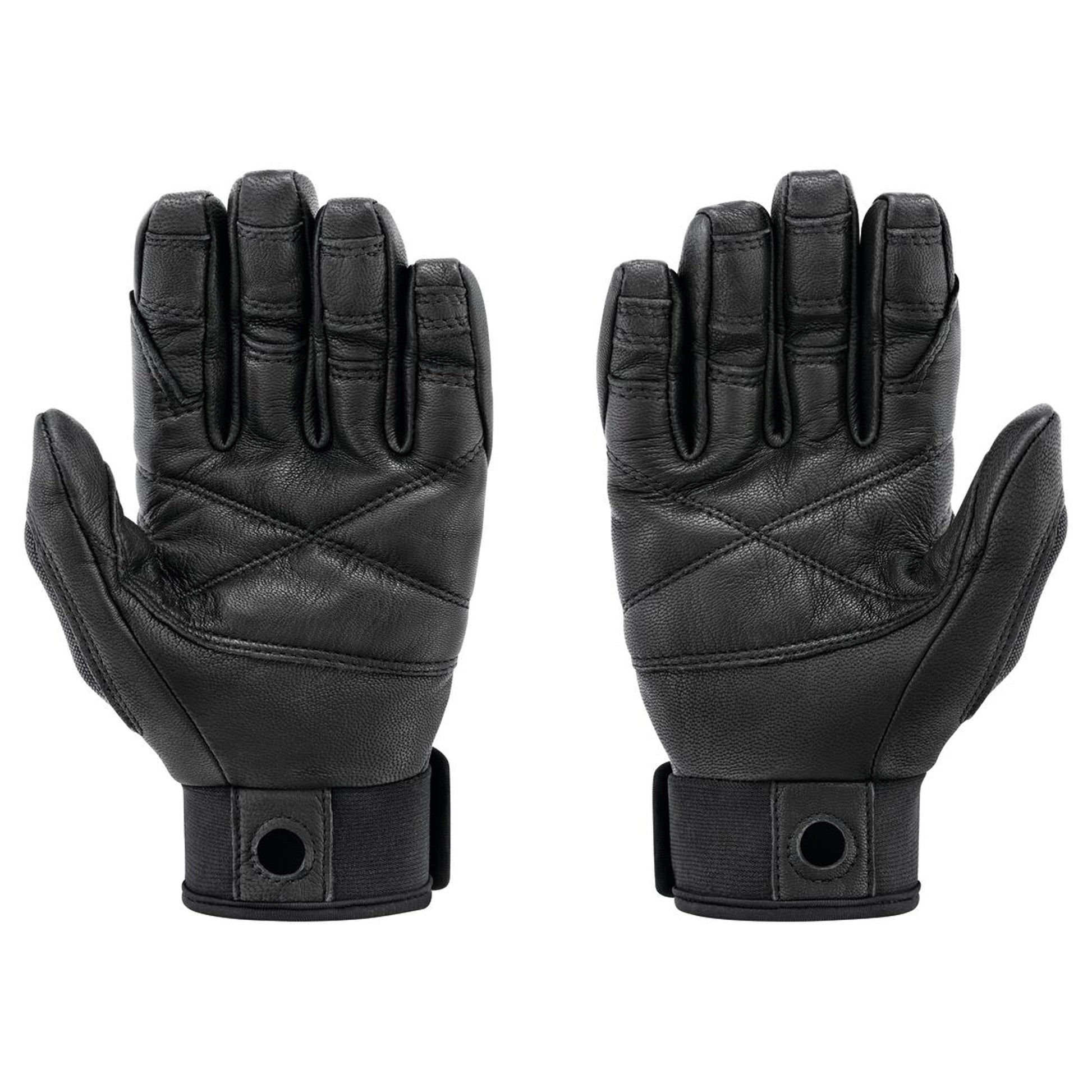 Die doppelte Lederschicht und die Verstärkungen schützen bei langen Abseilfahrten und beim Ablassen die Handfläche vor Verbrennungen. Die Fingerspitzen und die gefährdeten Handbereiche wurden zur Erhöhung der Widerstandsfähigkeit verstärkt. Der Handrücken ist aus Leder mit abriebfestem Nylonstretch an den Gelenken. Die in das Neoprenbündchen mit Klettverschluss eingearbeitete Öse dient dazu, die Handschuhe mit Hilfe eines Karabiners am Klettergurt zu befestigen.