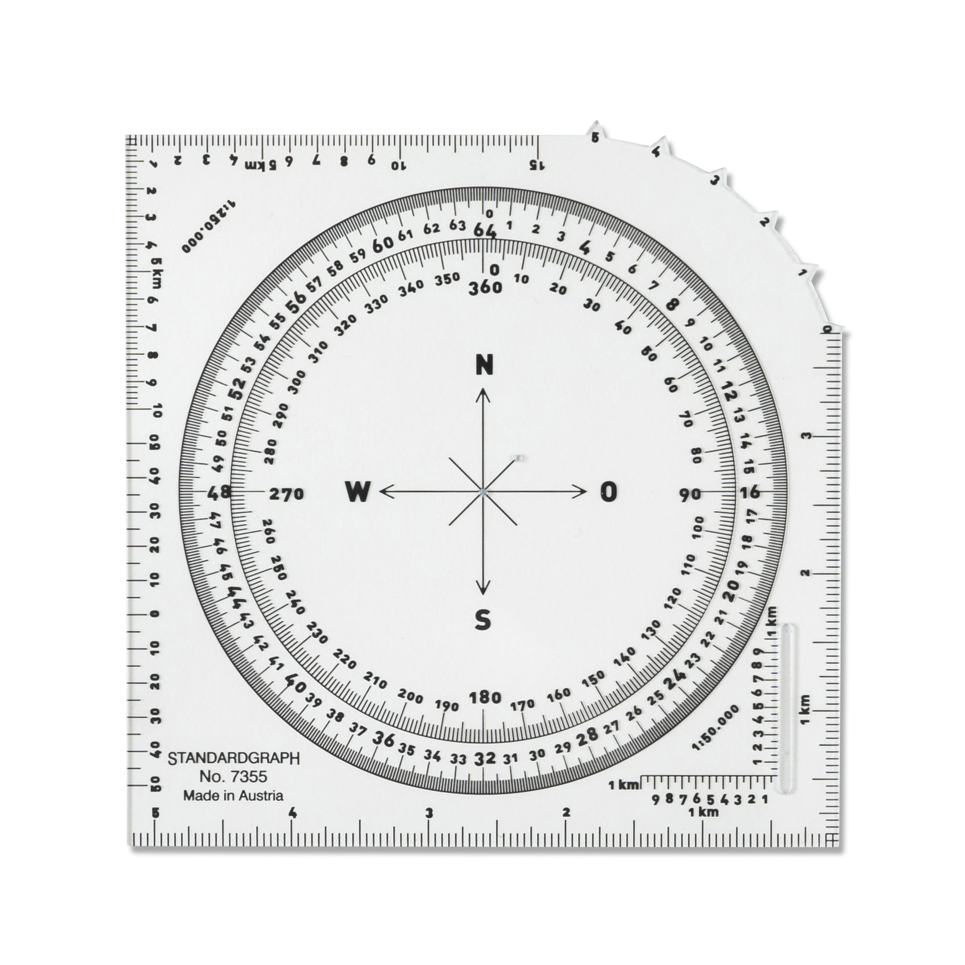 Standardgraph map protractor for measuring directional angles on a map. Plate made of transparent plastic with a thread attached to the center of the scale.