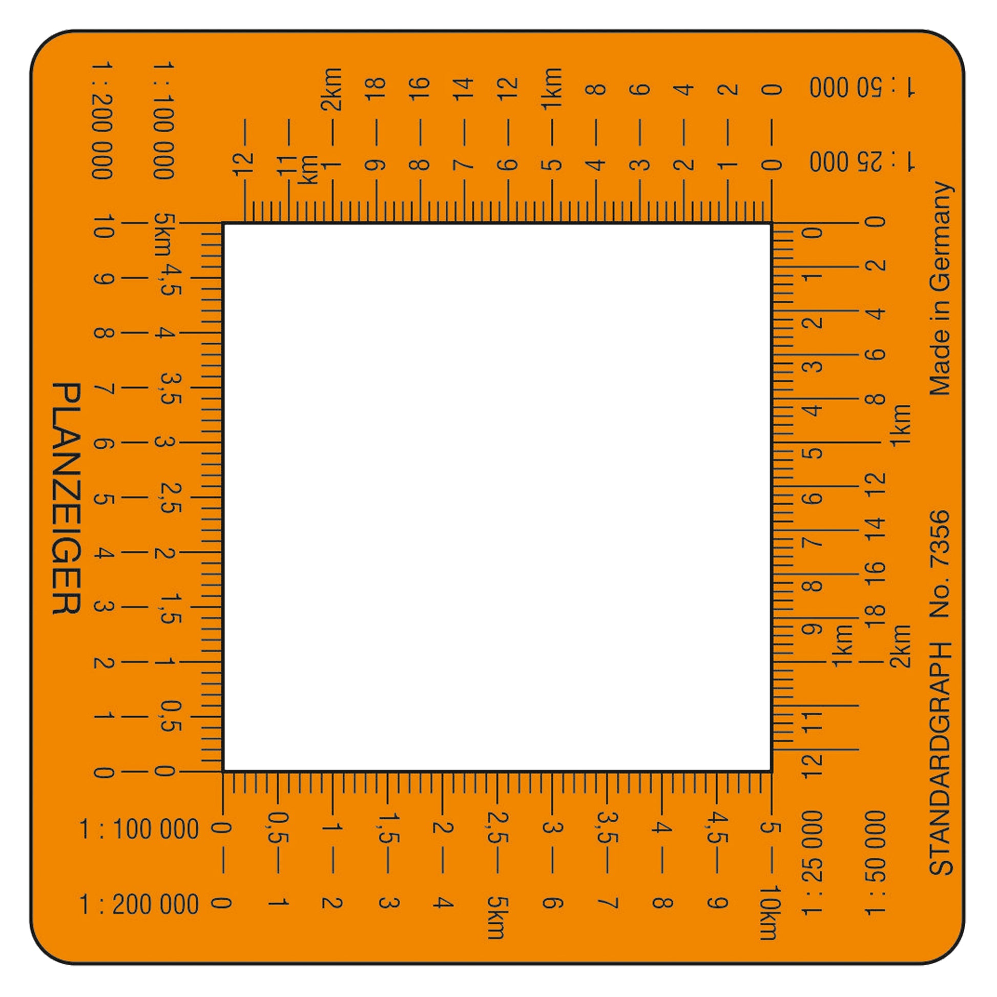 Standardgraph Planzeiger zur Ermittlung rechtwinkeliger Koordinaten auf Landkarten mit Gitternetz. Der Standardgraph Planzeiger besitzt die Teilungen 1:25.000, 1:50.000, 1:100.000 und 1:200.000