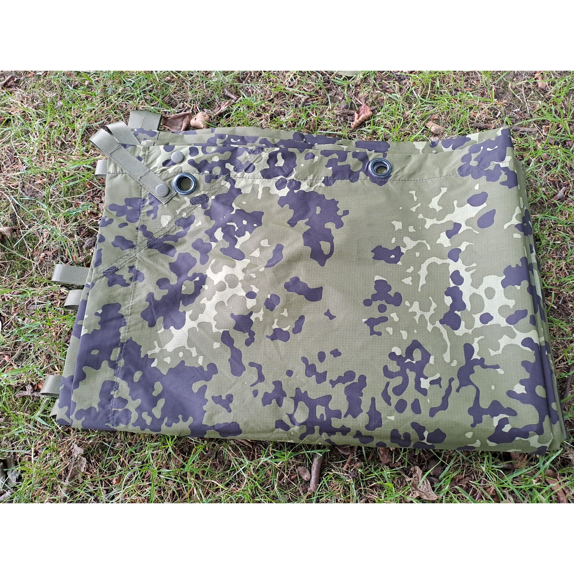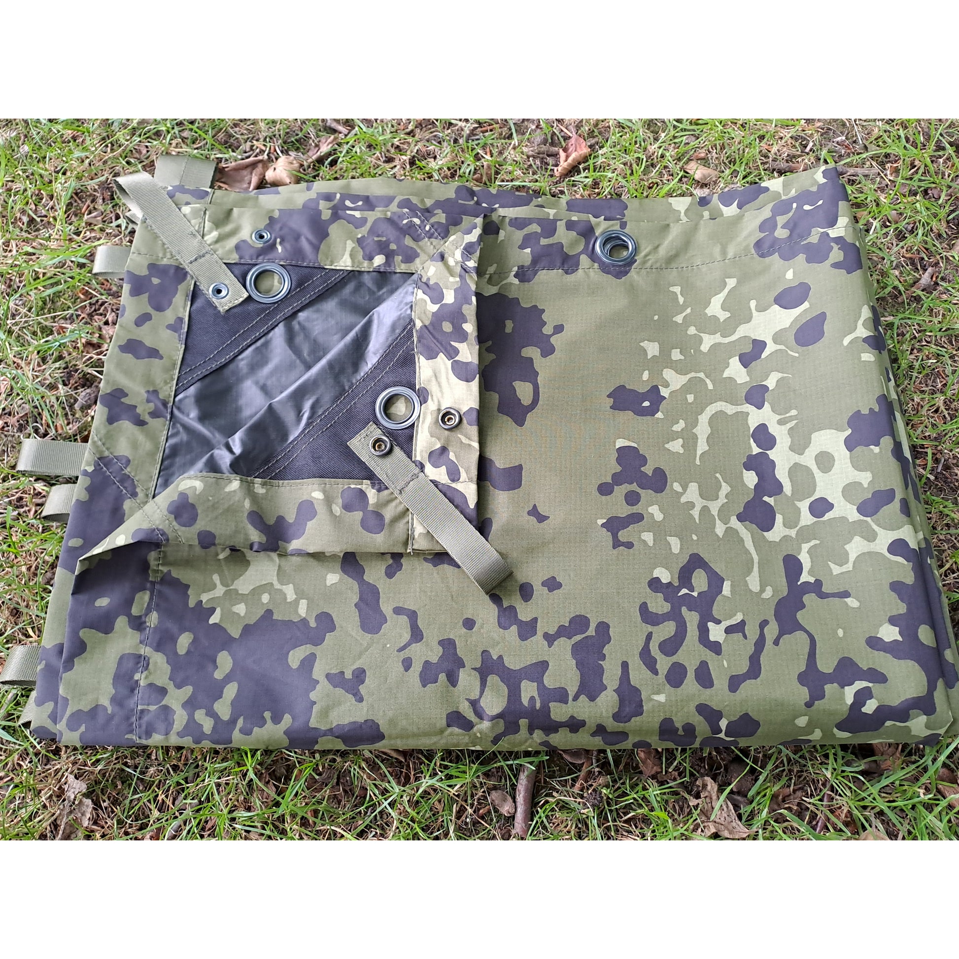 Das Tarp besteht aus einem leichten und robustem Ripstop-Gewebe. Die Innenseite des Tacgear Tarp (Basha) besitzt eine schwarze, lichtabweisende und wasserdichte PU-Beschichtung nach Forderung des Kommando-Spezial-Kräfte (KSK).