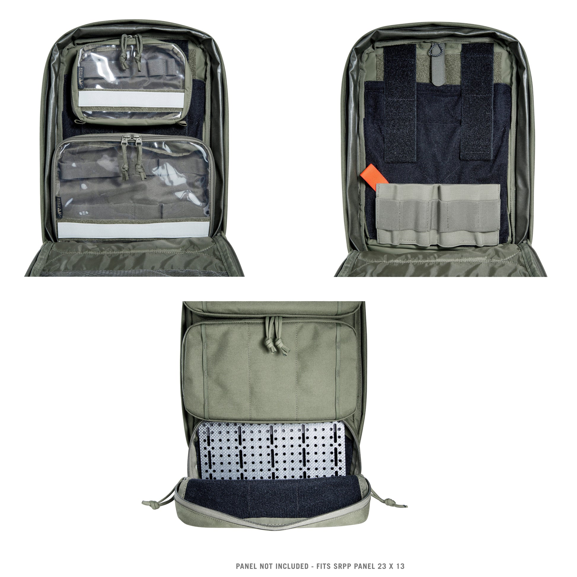 Der TT Modular Chest Rig Pack ist zur Verwendung mit dem TT Modular Chest Rig 4xM4 konzipiert. Er kann auch an Plattenträgern befestigt (Adapter im Lieferumfang enthalten) oder allein verwendet werden. Der Rucksack verfügt über ein Hauptfach, drei Fronttaschen und einen Einschub für eine Schutzplatte, das Volumen lässt sich zwischen 12 und 20 Litern variieren.