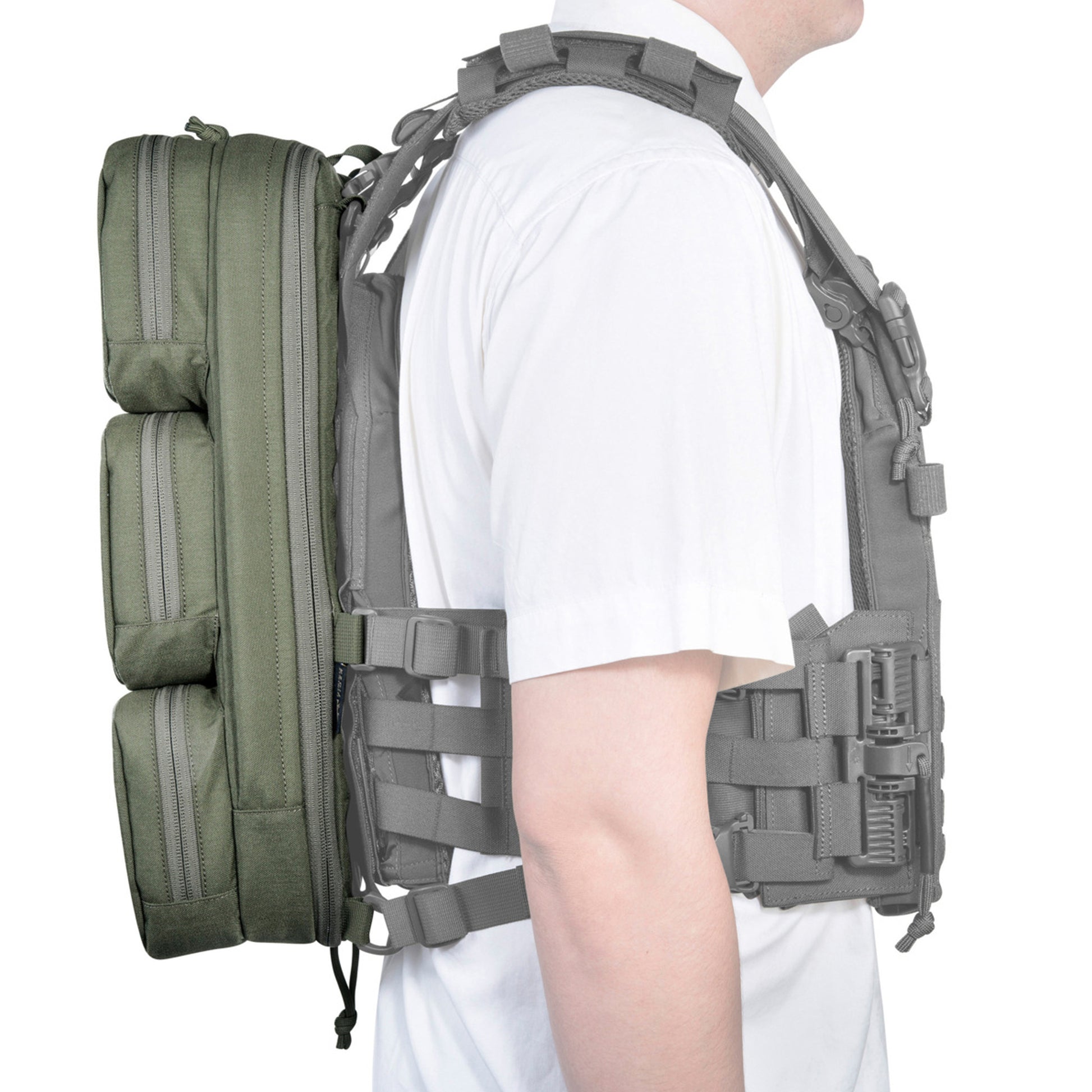 Der TT Modular Chest Rig Pack ist zur Verwendung mit dem TT Modular Chest Rig 4xM4 konzipiert. Er kann auch an Plattenträgern befestigt (Adapter im Lieferumfang enthalten) oder allein verwendet werden. Der Rucksack verfügt über ein Hauptfach, drei Fronttaschen und einen Einschub für eine Schutzplatte, das Volumen lässt sich zwischen 12 und 20 Litern variieren.