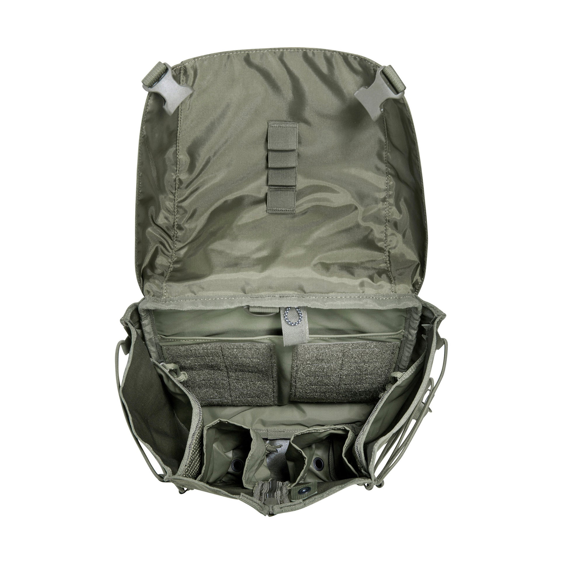 Das Hauptfach des Rucksacks ist mit MOLLE-Klett zur individuellen Bestückung versehen und verfügt über zwei Netz-Innentaschen sowie eine Bungee-Cord-Kompression. Der Deckel ist mit einem Reißverschlussfach ausgestattet. Durch das ausklappbare Hauptfach eignet sich der Rucksack auch für den Transport von Bolzenschneidern.