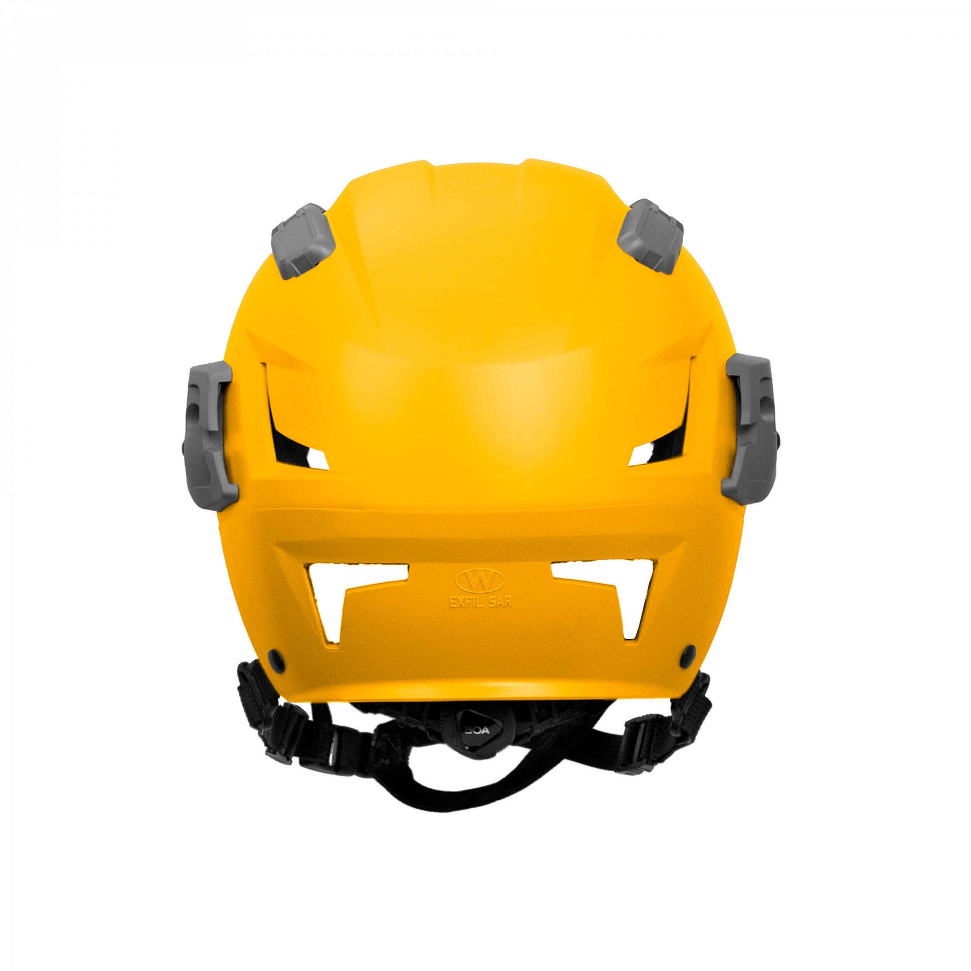 - HINWEIS: EN 14052 erfordert einen Kinnriemen mit geringer Stärke, der EXFIL® SAR ist nicht vollständig nach BS EN 14052:2012 zertifiziert, um die strengeren Kinnriemenanforderungen der BS EN 12492:2012 zu erfüllen und das Risiko zu verringern, den Helm bei einem Sturz zu verlieren