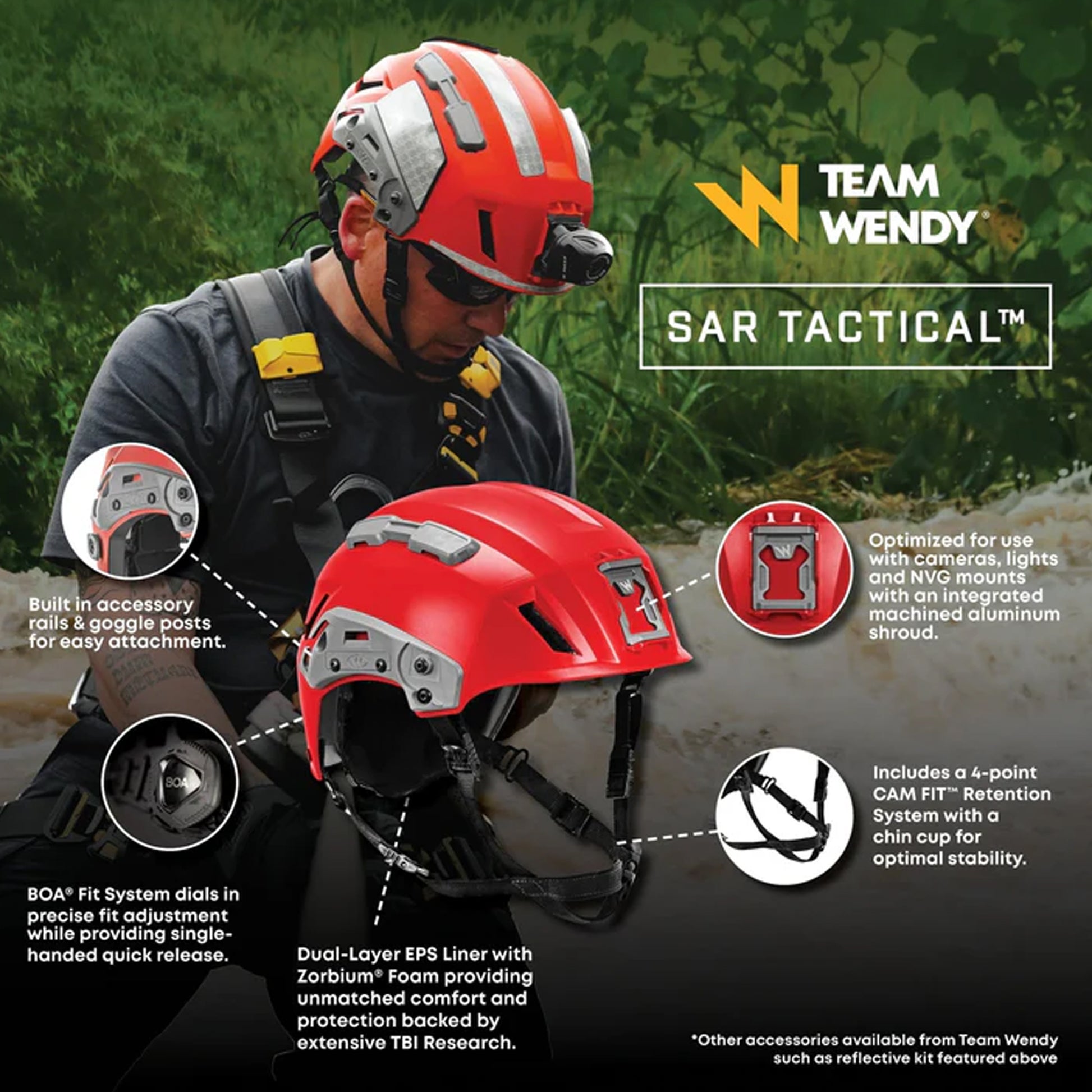 Der Team Wendy® EXFIL® SAR Tactical™ basiert auf dem EXFIL® SAR Backcountry™ Helm. Die Unterschiede liegen in der NVG-/Lampen-Halterung und bei dem Kinnrimen-Verschluss. Beim SAR Tactical™ besteht die NVG-/Lampen-Halterung aus gefrästem Aluminium, und bei dem SAR Backcountry™ aus Polycarbonat. Der Kinnriemen-Verschluss besitzt beim SAR Tactical™ einen Steckschnallen-Schnellverschluss und der SAR Backcountry™ einen FidLock® Magnetschnallenverschluss.