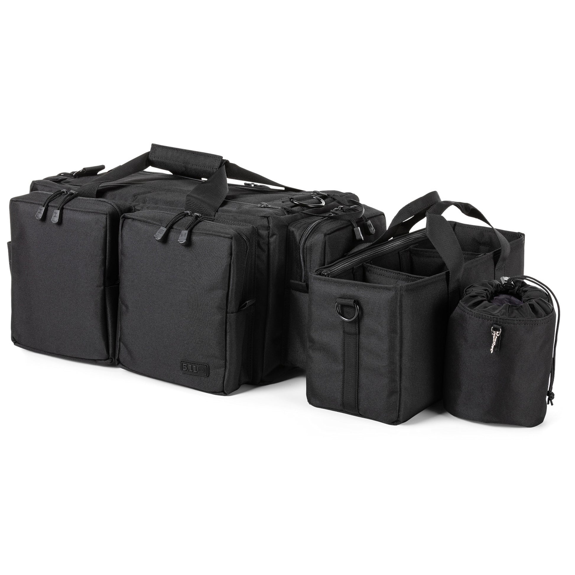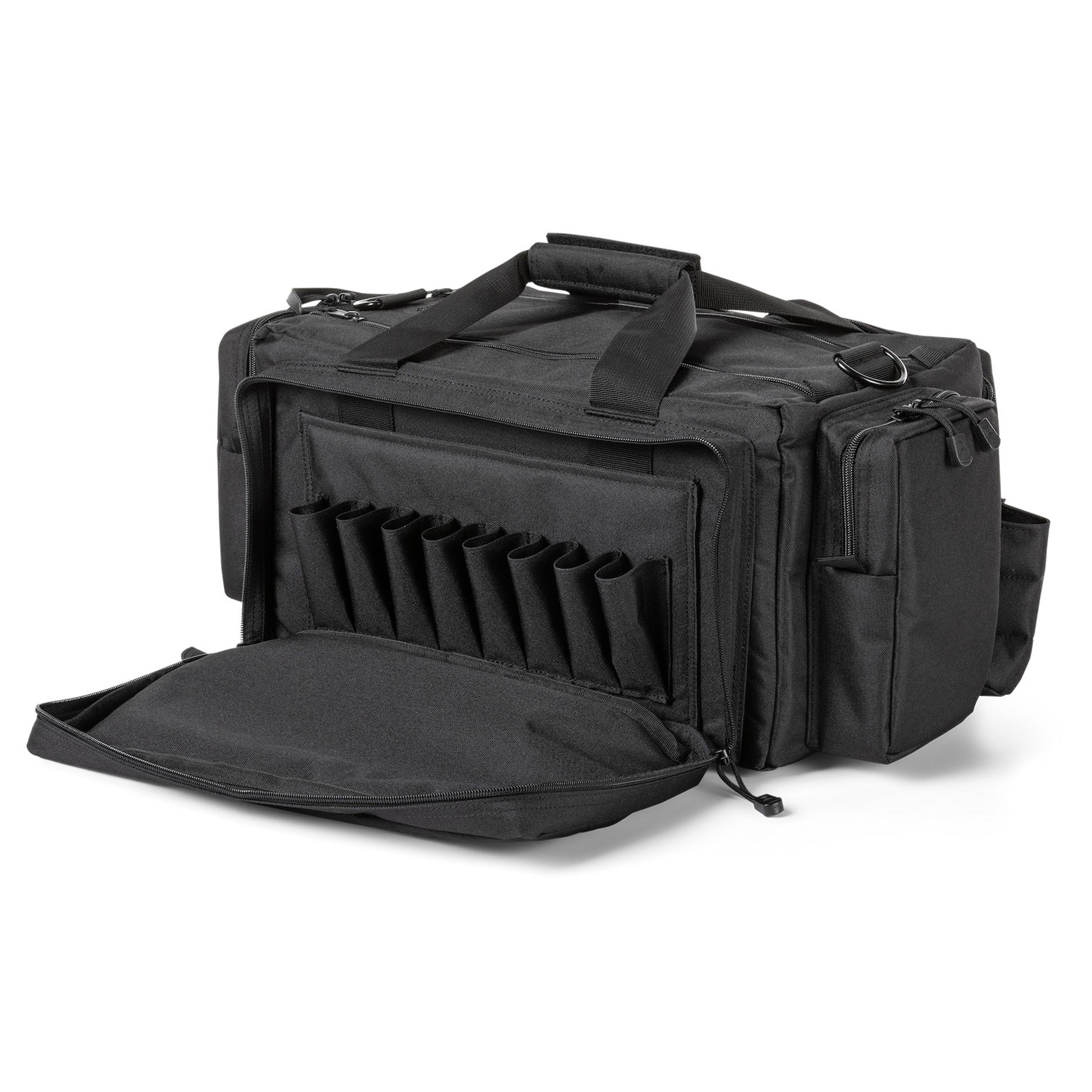 Der 5.11 Tactical Range Ready Bag ist aus haltbarem, wetterfestem 600D Polyester hergestellt. Er verfügt über separate, gepolsterte Fächer für mehrere Pistolen, einen Organizer mit Reißverschluss auf der Vorderseite, in dem 8 Magazine aufbewahrt werden können, sowie Seitentaschen und eine herausnehmbare Munitionstasche. Das erleichtert die Reinigung und stellt die Munitionsversorgung sicher. Mit einem gepolsterten Schultergurt, griffigen Tragegriffen und einem Einsatz für ein Namensschild bist Du im Handumdrehen auf dem Schießstand zu Hause.