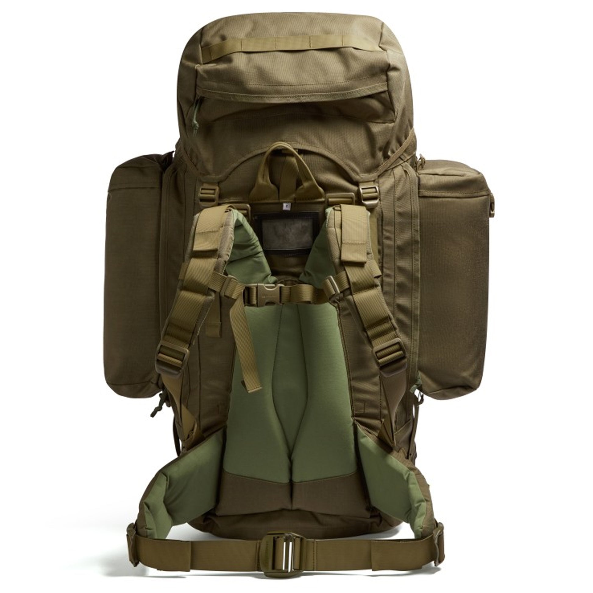 Am Rucksackkörper befinden sich Skibefestigungspunkte. Die Skibefestigungspatches sind aus einem flexiblen Hypolon-Gewebe gefertigt. Zwei abnehmbare MMPS-Seitentaschen lassen sich mit einem Reißverschluss zu einem Tagesrucksack zusammenfügen (Schultergurte, Brustgurt und Armlehnengurte sind im Lieferumfang enthalten).