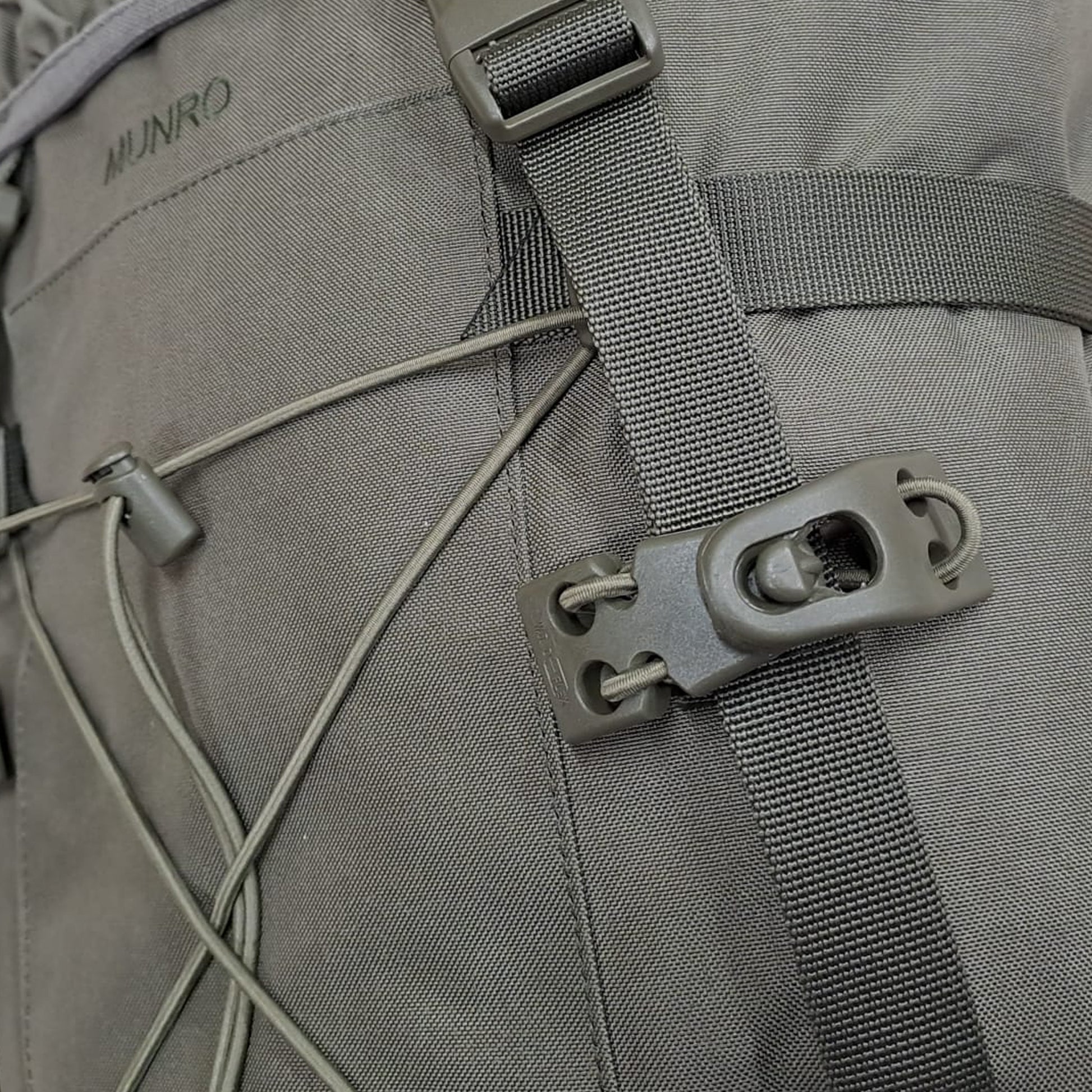 Das Material des Munro II IR "stone grey olive" besteht aus CORDURA 560 DTEX, einem 560 Denier Polyamid 6.6 Cordura, das die strengen Anforderungen der Bundeswehr TL 8305-0278 erfüllt, inklusive eines High-End-Infrarotschutzes (IRR 600 bis 850 nm / ca. 12 pct.). Alle Schnallen, Gurtbänder und Klettbänder erfüllen ebenfalls die Anforderungen der Bundeswehr bezüglich der IRR-Tarnwirkung.