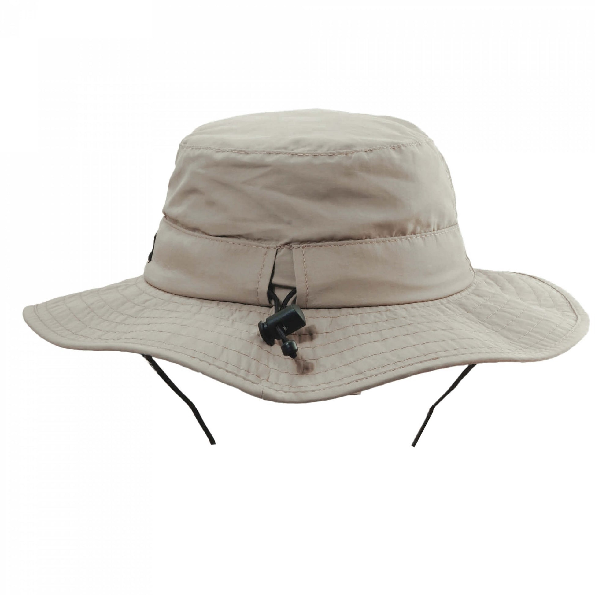 Der Boonie von Dorfman Pacific Company ist ein klassischer Reisehut und besteht aus einem robusten und funktionellen Supplex-Material. Dieses Material bietet einen ausgezeichneten Schutz, zudem ist es wasserabweisend und schnell trocknend. Ein innenseitiges Coolmax®-Schweißband und ein luftiges Mesh-Futter nehmen Schweiß schnell auf und leiten ihn nach außen. Die breite Krempe des Outdoor-Huts ist sehr formstabil und schützt somit ausgezeichnet vor Sonneneinstrahlung. Dank der Weitenregulierung und einem Kinnband sitzt der Hut perfekt am Kopf, auch bei stärkeren Windböen. Die Oberseite des Huts ist beige, die Unterseite der Krempe dunkelgrün, um das Sonnenlicht abzuschirmen.