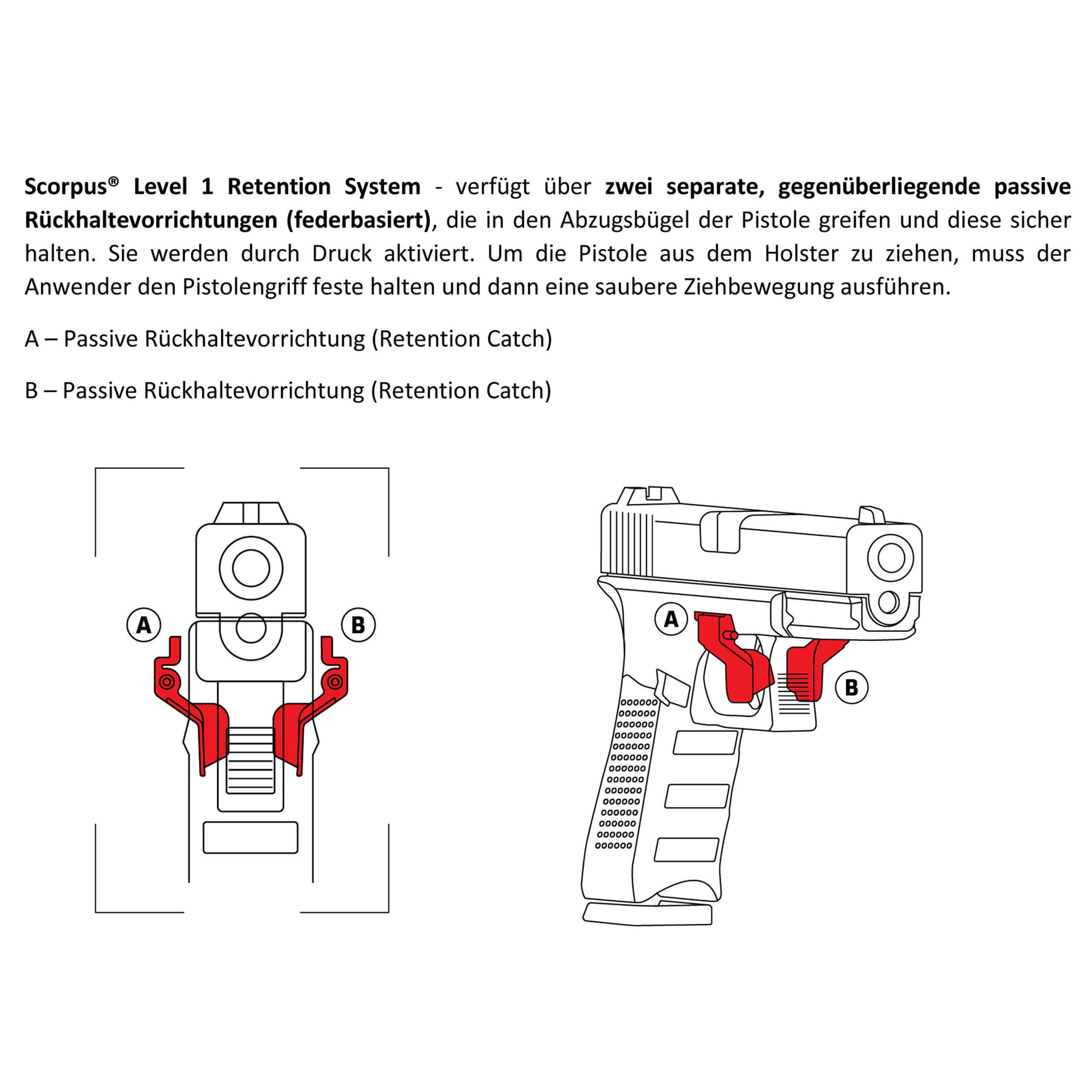 Das FAB Defense Scorpus M1 G-9 Holster Level 1 verfügt über zwei separate passive Sicherungsmechanismen, die die Handfeuerwaffe automatisch sichern, indem sie den Abzugsbügel erfassen. Beide Sicherungsvorrichtungen werden durch Druck aktiviert. Um die Handfeuerwaffe zu ziehen, muss der Anwender den Griff fest umfassen und einen sauberen Zug ausführen.