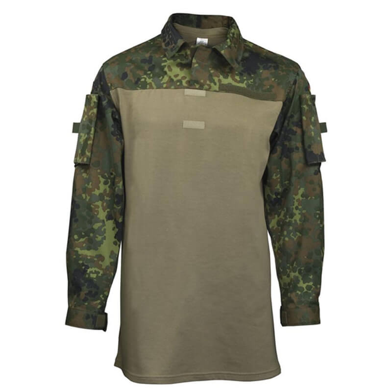 Das für das Tragen unter Schutzwesten vorgesehene Combat Shirt von Leo Köhler ist eine Mischung aus Tropenunterhemd gekoppelt mit den Ärmeln einer Feldbluse. Es besteht aus dem klassischen Unterhemd mit einem festen und brandhemmenden Feldblusenstoff im Schulter- und Armbereich. Durch den hohen Hemdkragen wird das Risiko minimiert, dass Hülsen oder sonstige Gegenstände den Hals verletzen. Hergestellt von Leo Köhler GmbH & Co. KG.