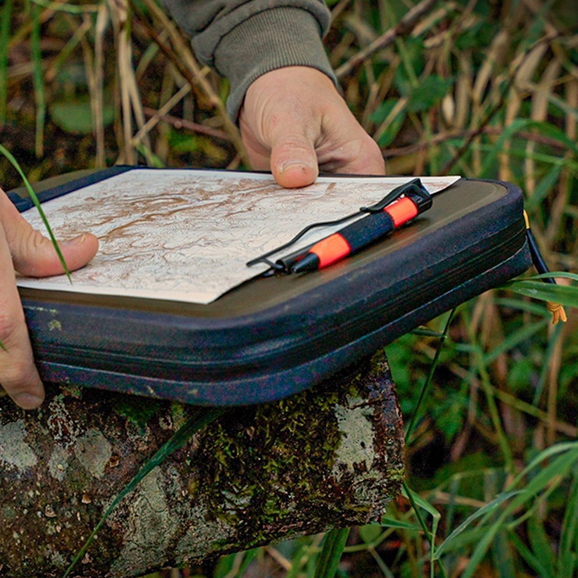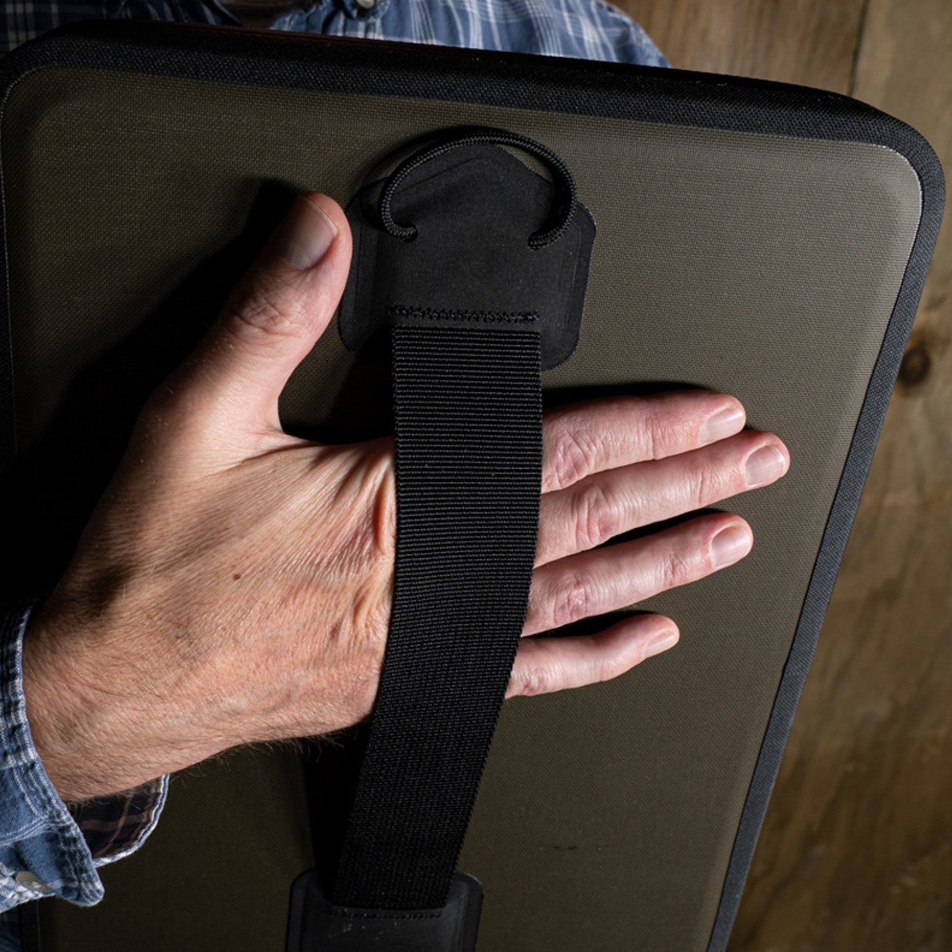 Der flache und robuste Gurtgriff auf der Rückseite ermöglicht es Ihnen, das Monsoon Field Desk mit eine Hand zu halten und mit der freien Hand weiterzuarbeiten. An dem Rücken befindet eine mit Klett verstellbare Handschlaufe, damit Sie den Monsoon Field Desk auch mit Handschuhen tragen können.