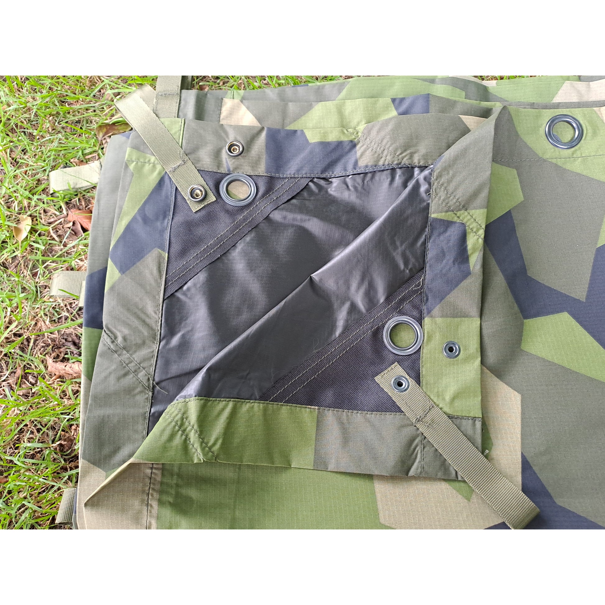 Das Tarp besteht aus einem leichten und robustem Ripstop-Gewebe. Die Innenseite des Tacgear Tarp (Basha) besitzt eine schwarze, lichtabweisende und wasserdichte PU-Beschichtung nach Forderung des Kommando-Spezial-Kräfte (KSK).