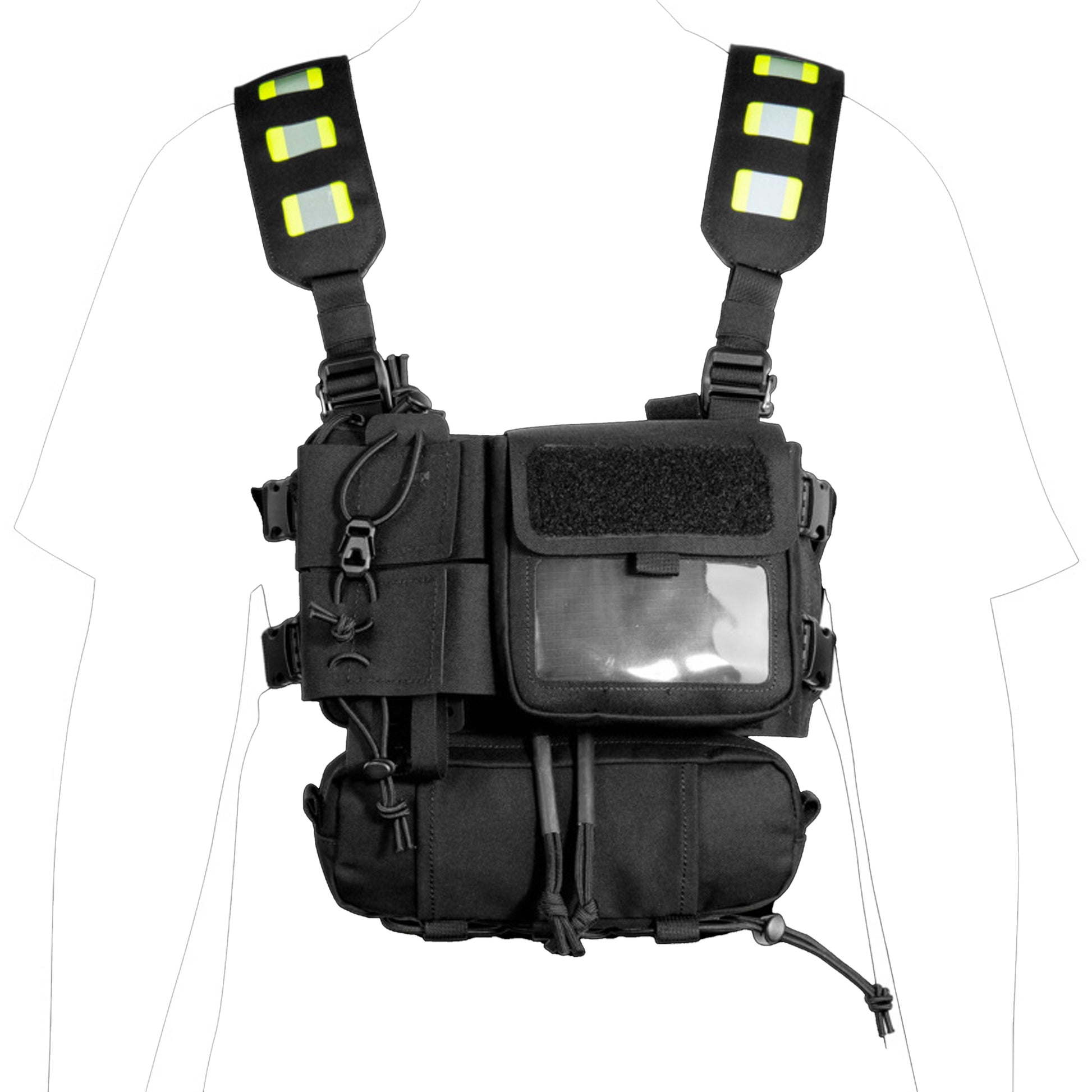 Das TT Security Pro Rig besitzt eine signalfarbige Kennzeichnung der Schultergurte (Streifen herausnehmbar) sowie ein Klarsichtfach für Ausweise. Es verfügt über diverse Taschen zur Organisation der Ausrüstung und kann auch individuell konfiguriert werden: Funkgerätetasche und untere Tasche sind abnehmbar, und der Seitenflügel mit Lasercut-MOLLE kann zur Befestigung weiterer Pouches genutzt werden. Die rückseitige Polsterung ist abnehmbar,wenn das Gurtzeug auf Plattenträgern montiert werden soll (Adapter sind nicht im Lieferumfang enthalten).
