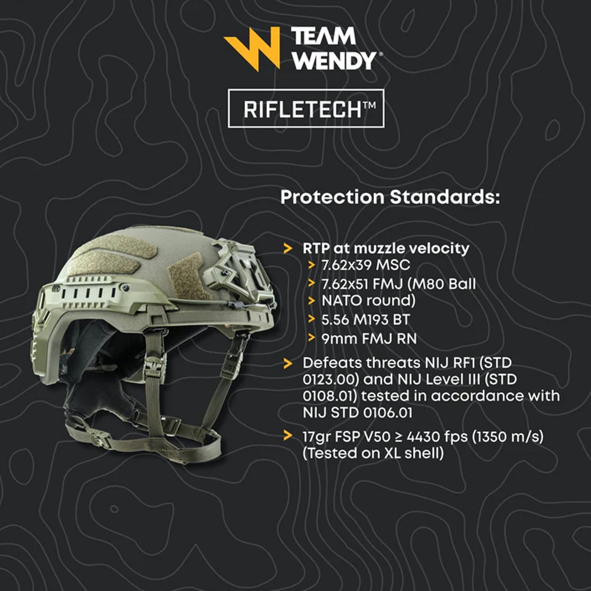 Der RIFLETECH™-Helm von Team Wendy bietet ballistischen Schutz auf Elite-Niveau und ganztägigen Tragekomfort in einem leichten, einsatzbereiten Design. Sein RIFLETECH™ Air Fit-Innensystem, das durch umfangreiche Forschungen zur Prävention traumatischer Hirnverletzungen entwickelt wurde, bietet branchenführenden Aufprallschutz und Atmungsaktivität. In Kombination mit der patentierten Seamless Shell Technology von Team Wendy Ceradyne, einer beeindruckenden Durchschlagfestigkeit bei Mündungsgeschwindigkeit und einer V50-Bewertung von bis zu 4430+ ft/s bietet RIFLETECH™ eine für Gewehre geeignete Leistung ohne strukturelle Schwachstellen und maximiert so die Überlebensfähigkeit in Umgebungen mit hoher Bedrohung.