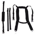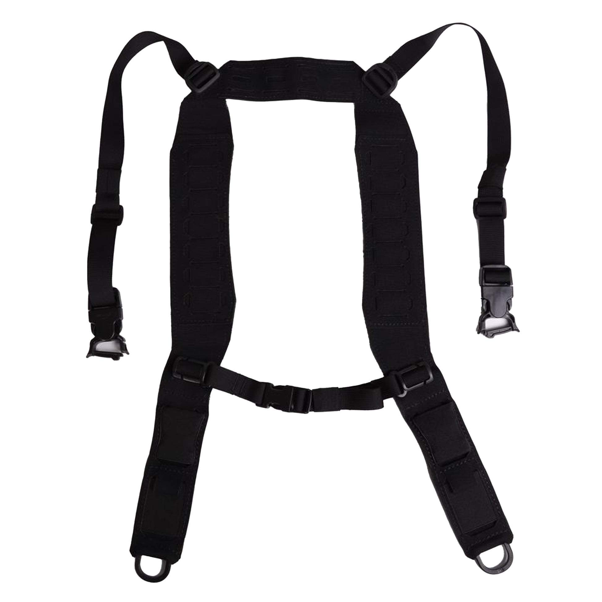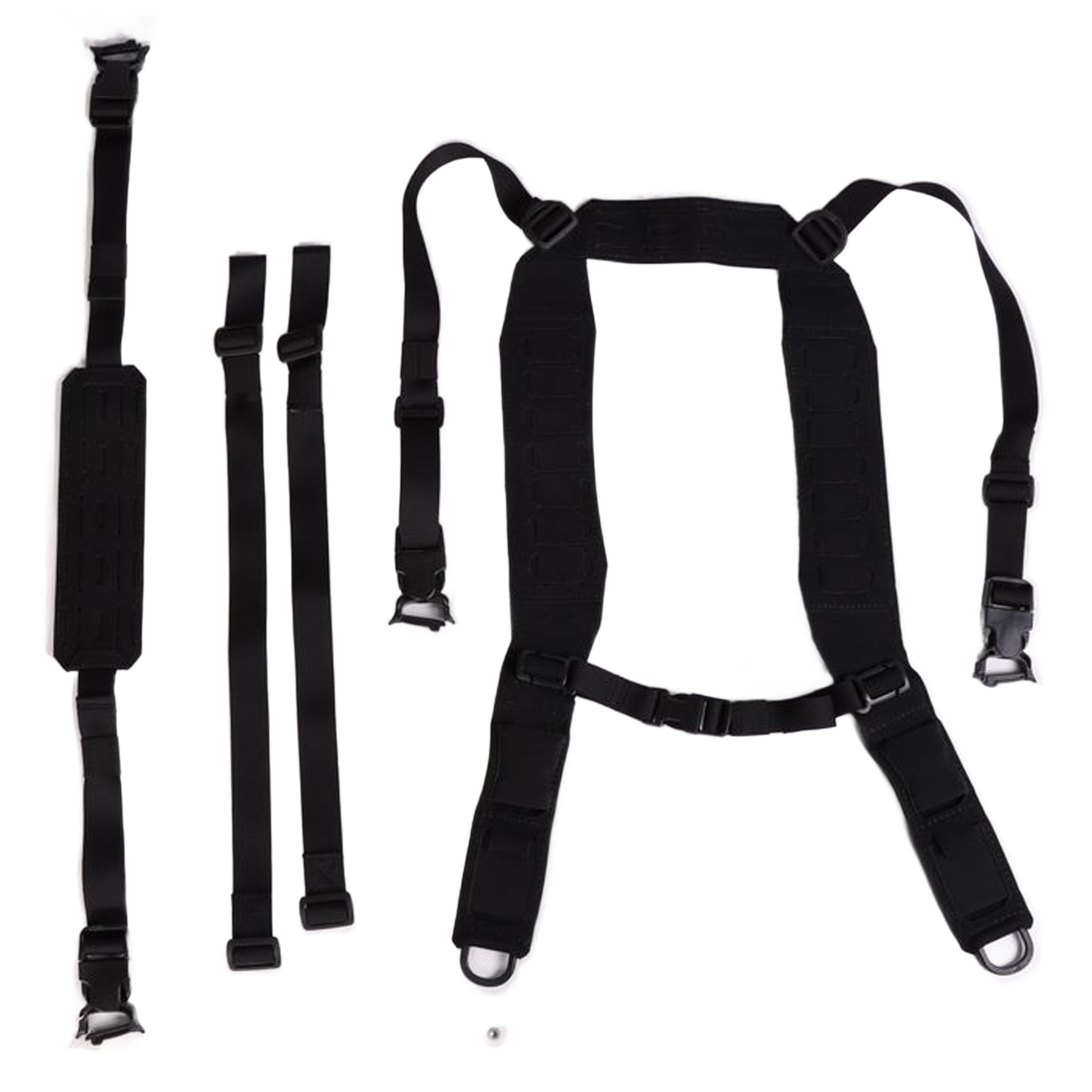 Das Set besteht aus einem H-förmigen Tragegestell mit Brustgurt, zwei D-Ringen und vier Schnellverschlüssen für eine einfache Montage. Die Innenseite ist mit weichem Klett (Flausch) ausgekleidet, um zusätzliche Polsterungen anzubringen. An den Schultergurten befinden sich MOLLE-kompatible Löcher zur Befestigung weiterer Taschen, Trinkschläuche oder Kommunikationssysteme. Das lasergeschnittene Design sorgt für eine enorme Gewichtsreduzierung, ohne die Tarnwirkung des Produkts zu beeinträchtigen. Alle Befestigungspunkte sind verstellbar, damit der Gurt genau passt. Der Brustgurt kann vollständig entfernt werden.
