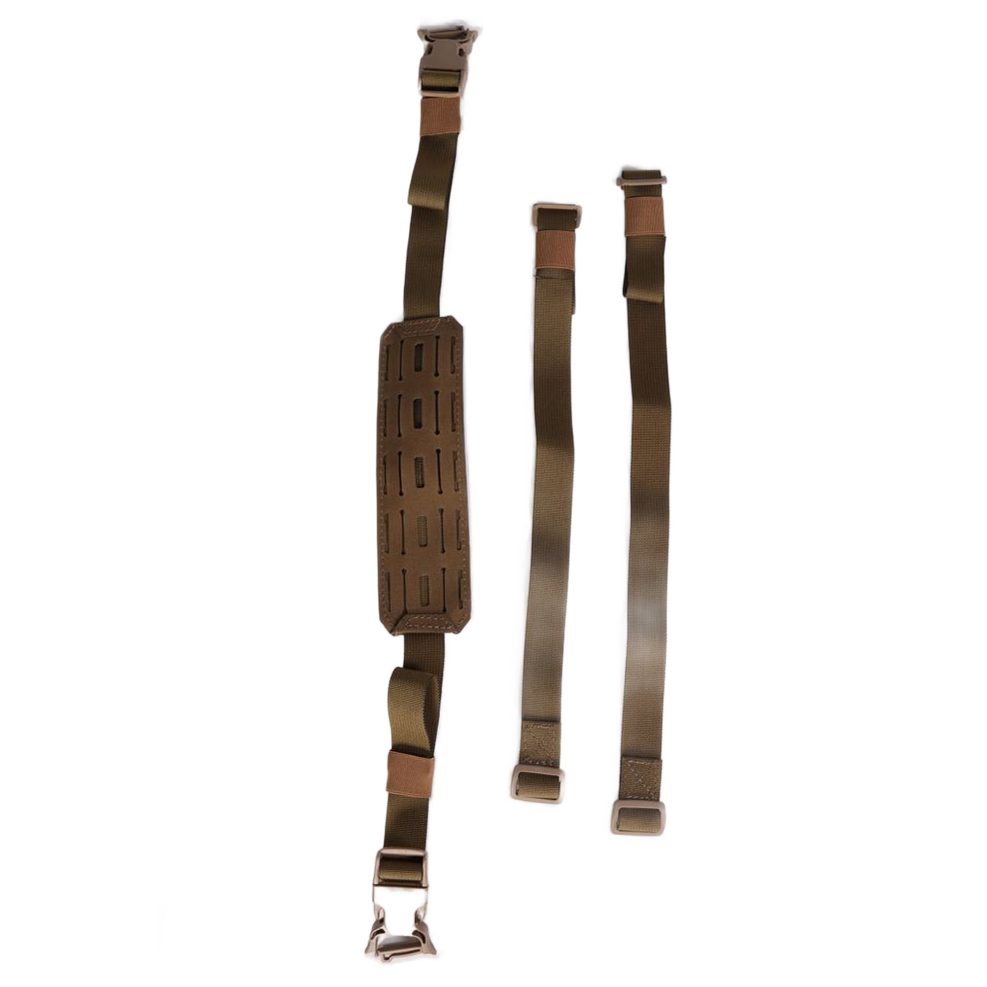 Das Set besteht aus einem H-förmigen Tragegestell mit Brustgurt, zwei D-Ringen und vier Schnellverschlüssen für eine einfache Montage. Die Innenseite ist mit weichem Klett (Flausch) ausgekleidet, um zusätzliche Polsterungen anzubringen. An den Schultergurten befinden sich MOLLE-kompatible Löcher zur Befestigung weiterer Taschen, Trinkschläuche oder Kommunikationssysteme. Das lasergeschnittene Design sorgt für eine enorme Gewichtsreduzierung, ohne die Tarnwirkung des Produkts zu beeinträchtigen. Alle Befestigungspunkte sind verstellbar, damit der Gurt genau passt. Der Brustgurt kann vollständig entfernt werden.