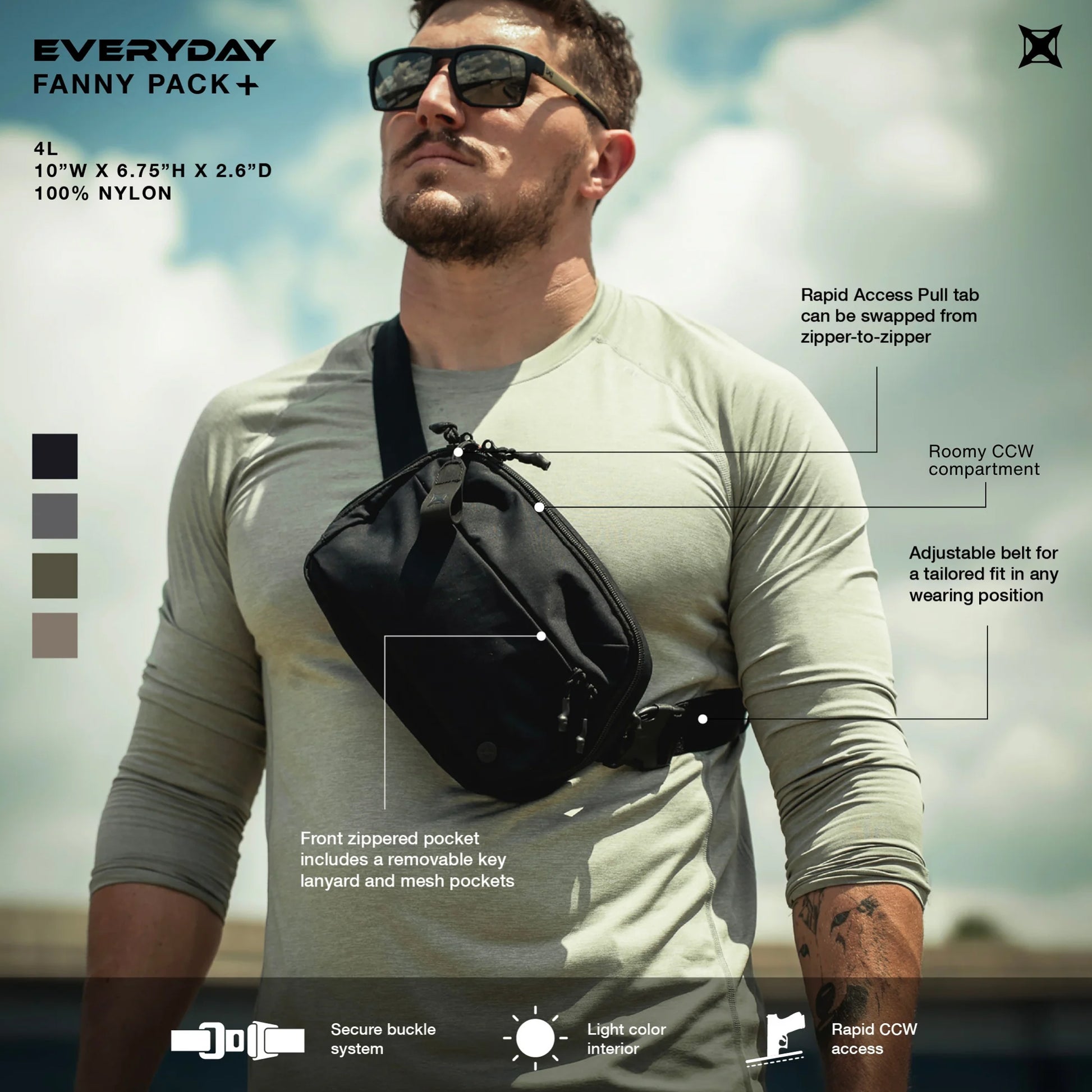 Das Shuriken-Logo aus Silikon auf der Rückseite verhindert ein Verrutschen und eignet sich perfekt zum Tragen mit Leggings oder anderen glatten Stoffen. Das Everyday Fanny Pack+ kann als Sling Pack über der Schulter und auch als Hüft-/ Bauchtasche getragen werden.