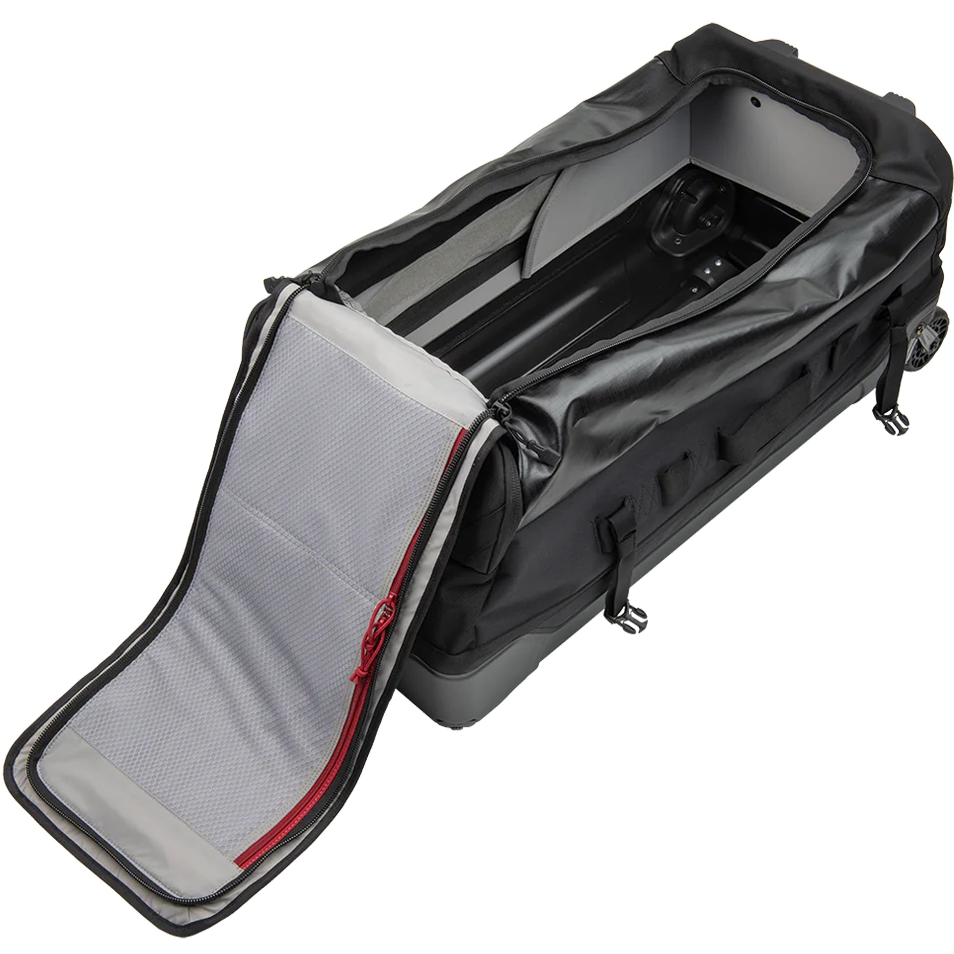 Das 100-Liter-Hauptfach lässt sich dank des umlaufenden Reißverschlusses weit aufklappen und leicht bepacken. Im Inneren bieten zwei Mesh-Taschen und Tactigami™️-kompatibles Flauschklett für anpassbare Innenorganisation. Das helle Innenfutter bietet auch im Dunkeln gute Sicht auf den Innenraum.
