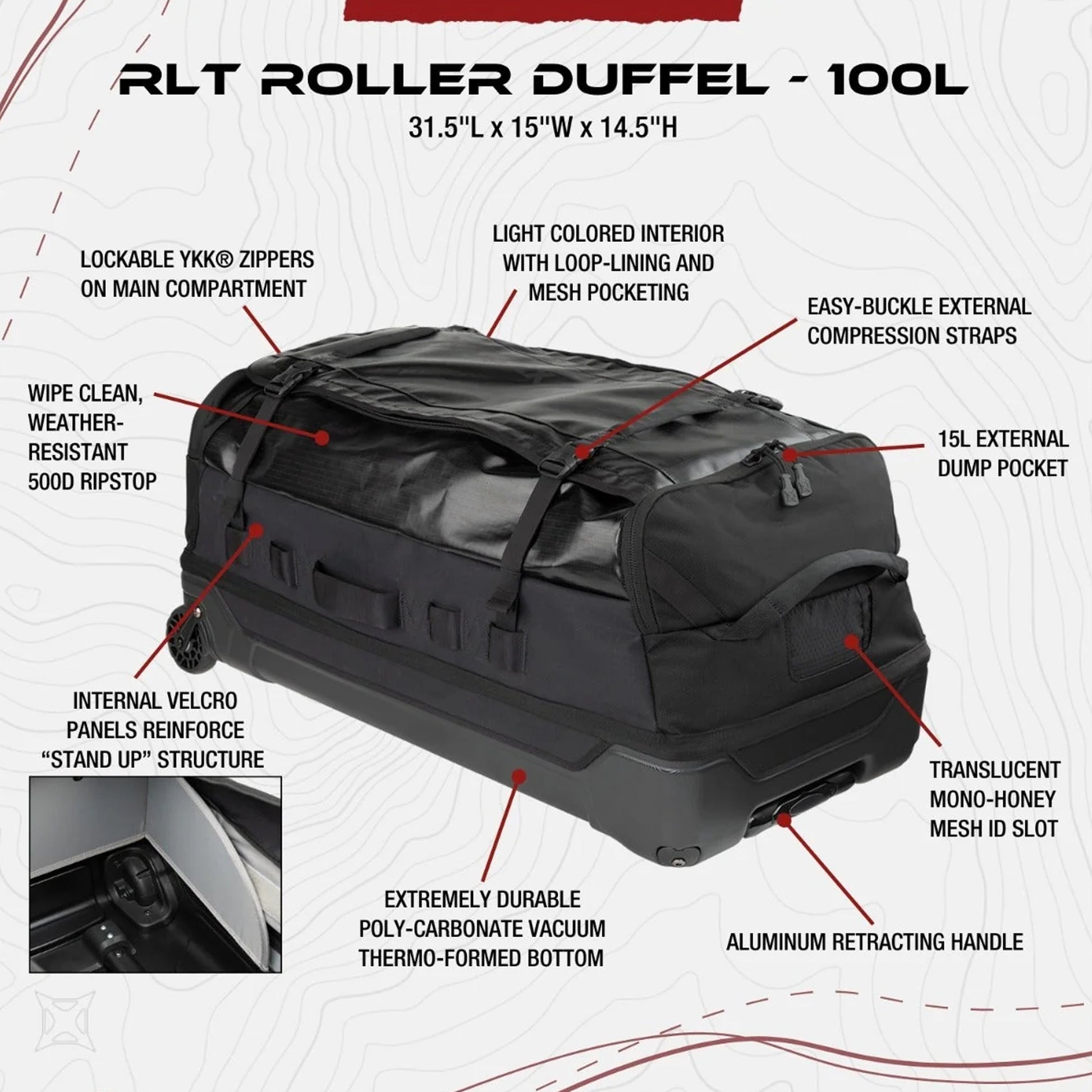 Der Vertx RLT 100L Duffel Bag Roller bietet mit seinen echten 100 Liter Volumen im Hauptfach und den 15 Liter in der Außentasche massig Platz für die Ausrüstung. Sein extrem robustes Außenmaterial, Konstruktion und geländetauglichen Rollen machen ihn zu der perfekten Transporttasche und Begleiter für die härtesten Einsätze und Abenteuer.