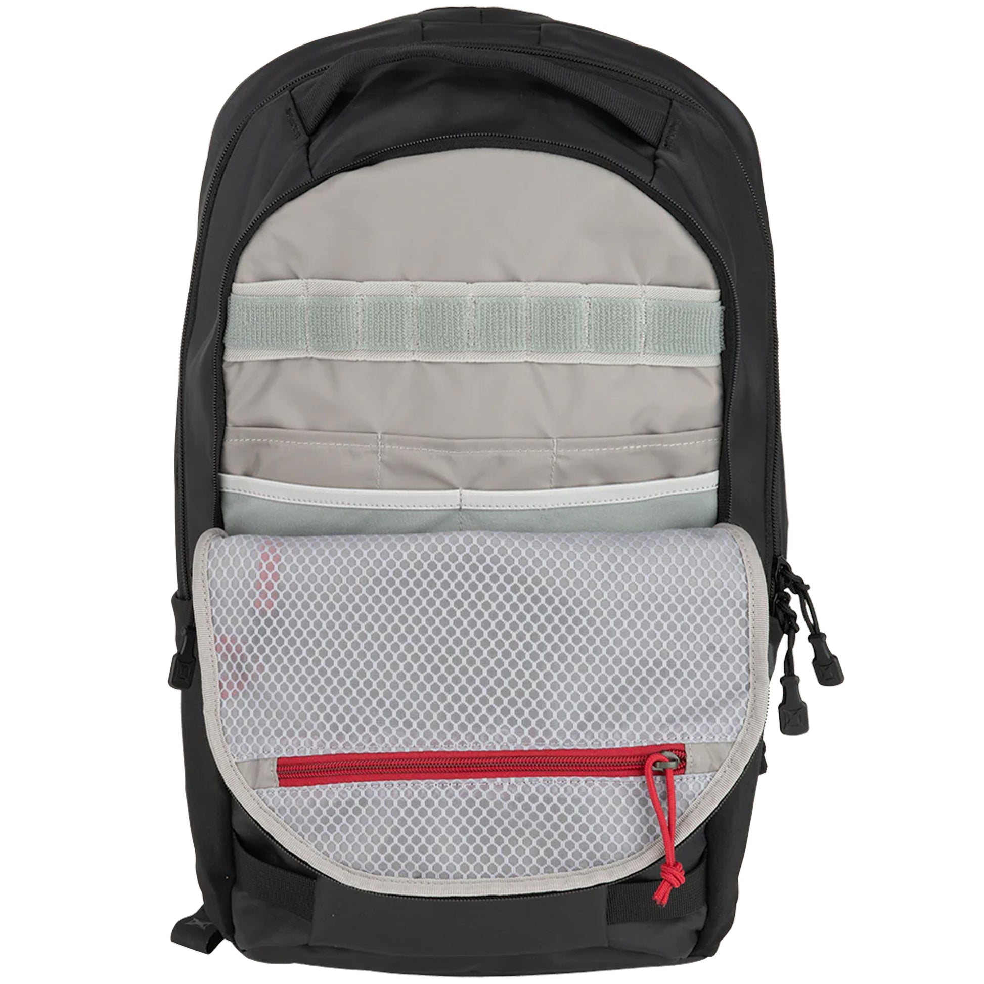 Die Organizer-Fronttasche ist ein EDC-Paradies - Der Reißverschluss auf der Vorderseite gibt den Blick frei auf Admin-Taschen, Stretch-Taschen und elastische Schlaufenaufnahmen - alles hat seinen Platz. In die elastischen Seitentaschen passen große (Nalgene-) Trinkflaschen, während das Hauptfach mit einer Trinkblase kompatibel ist.